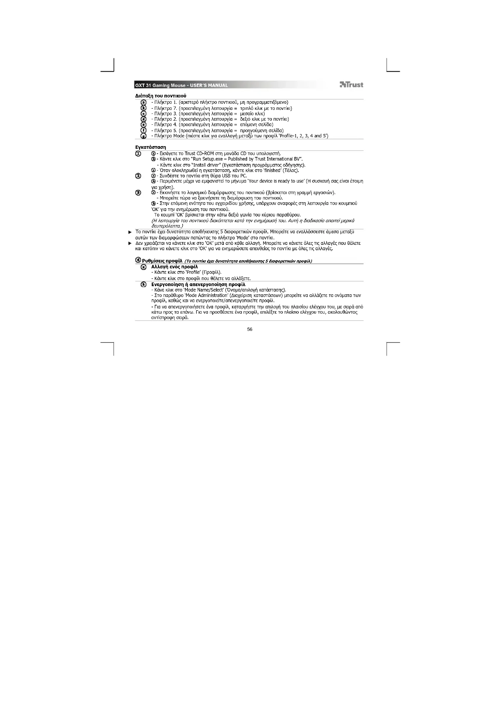 - Εισάγετε το Trust CD-ROM στη μονάδα CD του υπολογιστή. - Κάντε κλικ στο “Run Setup.exe – Published by Trust International BV”. - Κάντε κλικ στο “Install driver” (Εγκατάσταση προγράμματος οδήγησης). - Όταν ολοκληρωθεί η εγκατάσταση, κάντε κλικ στο ‘finished’ (Τέλος). - Συνδέστε το ποντίκι στη θύρα USB του PC. - Περιμένετε μέχρι να εμφανιστεί το μήνυμα ‘Your device is ready to use’ (Η συσκευή σας είναι έτοιμη για χρήση). - Εκκινήστε το λογισμικό διαμόρφωσης του ποντικιού (βρίσκεται στη γραμμή εργασιών). - Μπορείτε τώρα να ξεκινήσετε τη διαμόρφωση του ποντικιού. - Στην επόμενη ενότητα του εγχειριδίου χρήσης, υπάρχουν αναφορές στη λειτουργία του κουμπιού
