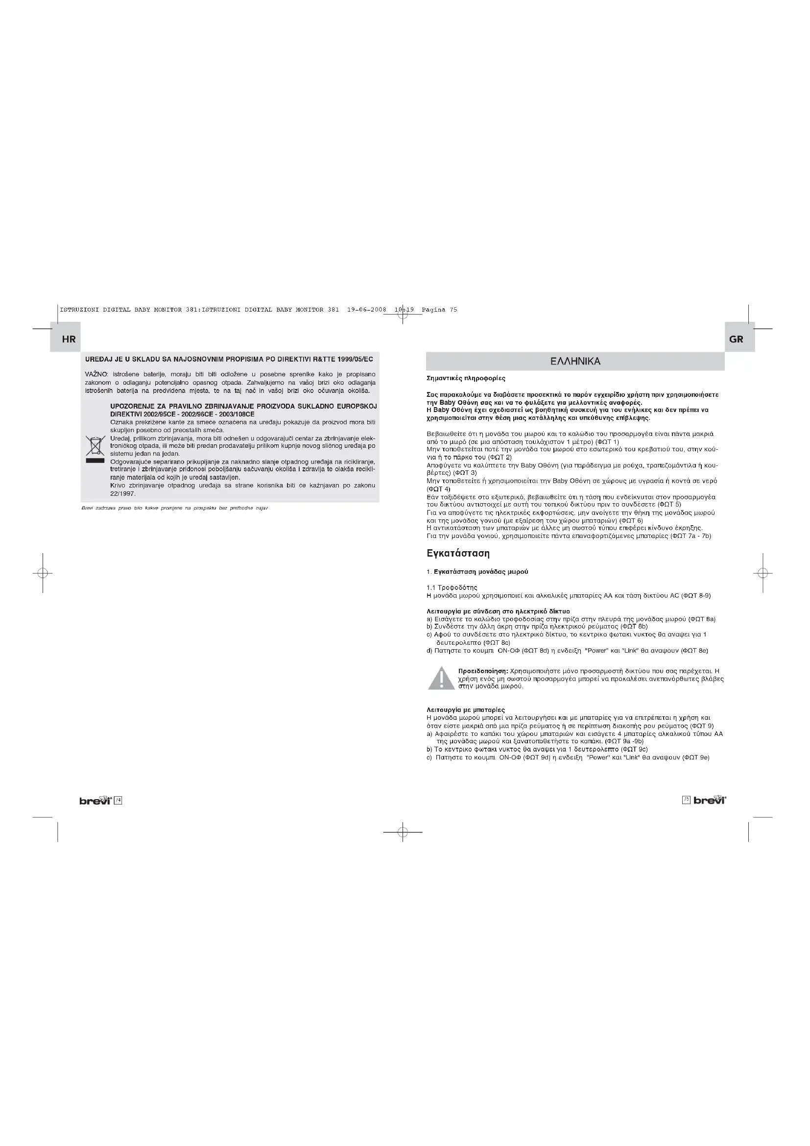 Oznaka prekrižene kante za smeće oznaćena na uređaju pokazuje da proizvod mora biti skupljen posebno od preostalih smeća. Uređaj, prilikom zbrinjavanja, mora biti odnešen u odgovarajuči centar za zbrinjavanje elek- troničkog otpada, ili može biti predan prodavatelju prilikom kupnje novog sličnog uređaja po sistemu jedan na jedan. Odgovarajuće separirano prikupljanje za naknadno slanje otpadnog uređaja na ricikliranje, tretiranje i zbrinjavanje pridonosi poboljšanju sačuvanju okoliša i zdravlja te olakša recikli- ranje materijala od kojih je uređaj sastavljen. Krivo zbrinjavanje otpadnog uređaja sa strane korisnika biti će kažnjavan po zakonu 22/1997. Brevi zadrzava pravo bilo kakve promjene na prospektu bez prethodne najav Σημαντικές πληροφορίες Σας παρακαλούμε να διαβάσετε προσεκτικά το παρόν εγχειρίδιο χρήστη πριν χρησιμοποιήσετε την Baby Οθόνη σας και να το φυλάξετε για μελλοντικές αναφορές. Η Baby Οθόνη έχει σχεδιαστεί ως βοηθητική συσκευή για του ενήλικες και δεν πρέπει να χρησιμοποιείται στην θέση μιας κατάλληλης και υπεύθυνης επίβλεψης. Βεβαιωθείτε ότι η μονάδα του μωρού και το καλώδιο του προσαρμογέα είναι πάντα μακριά από το μωρό (σε μια απόσταση τουλάχιστον 1 μέτρο) (ΦΩΤ 1) Μην τοποθετείται ποτέ την μονάδα του μωρού στο εσωτερικό του κρεβατιού του, στην κού- νια ή το πάρκο του (ΦΩΤ 2) Αποφύγετε να καλύπτετε την Baby Οθόνη (για παράδειγμα με ρούχα, τραπεζομάντιλα ή κου- βέρτες) (ΦΩΤ 3) Μην τοποθετείτε ή χρησιμοποιείται την Baby Οθόνη σε χώρους με υγρασία ή κοντά σε νερό (ΦΩΤ 4) Εάν ταξιδέψετε στο εξωτερικό, βεβαιωθείτε ότι η τάση που ενδείκνυται στον προσαρμογέα του δικτύου αντιστοιχεί με αυτή του τοπικού δικτύου πριν το συνδέσετε (ΦΩΤ 5) Για να αποφύγετε τις ηλεκτρικές εκφορτώσεις, μην ανοίγετε την θήκη της μονάδας μωρού και της μονάδας γονιού (με εξαίρεση του χώρου μπαταριών) (ΦΩΤ 6) Η αντικατάσταση των μπαταριών με άλλες μη σωστού τύπου επιφέρει κίνδυνο έκρηξης. Για την μονάδα γονιού, χρησιμοποιείτε πάντα επαναφορτιζόμενες μπαταρίες (ΦΩΤ 7a - 7b) Εγκατάσταση