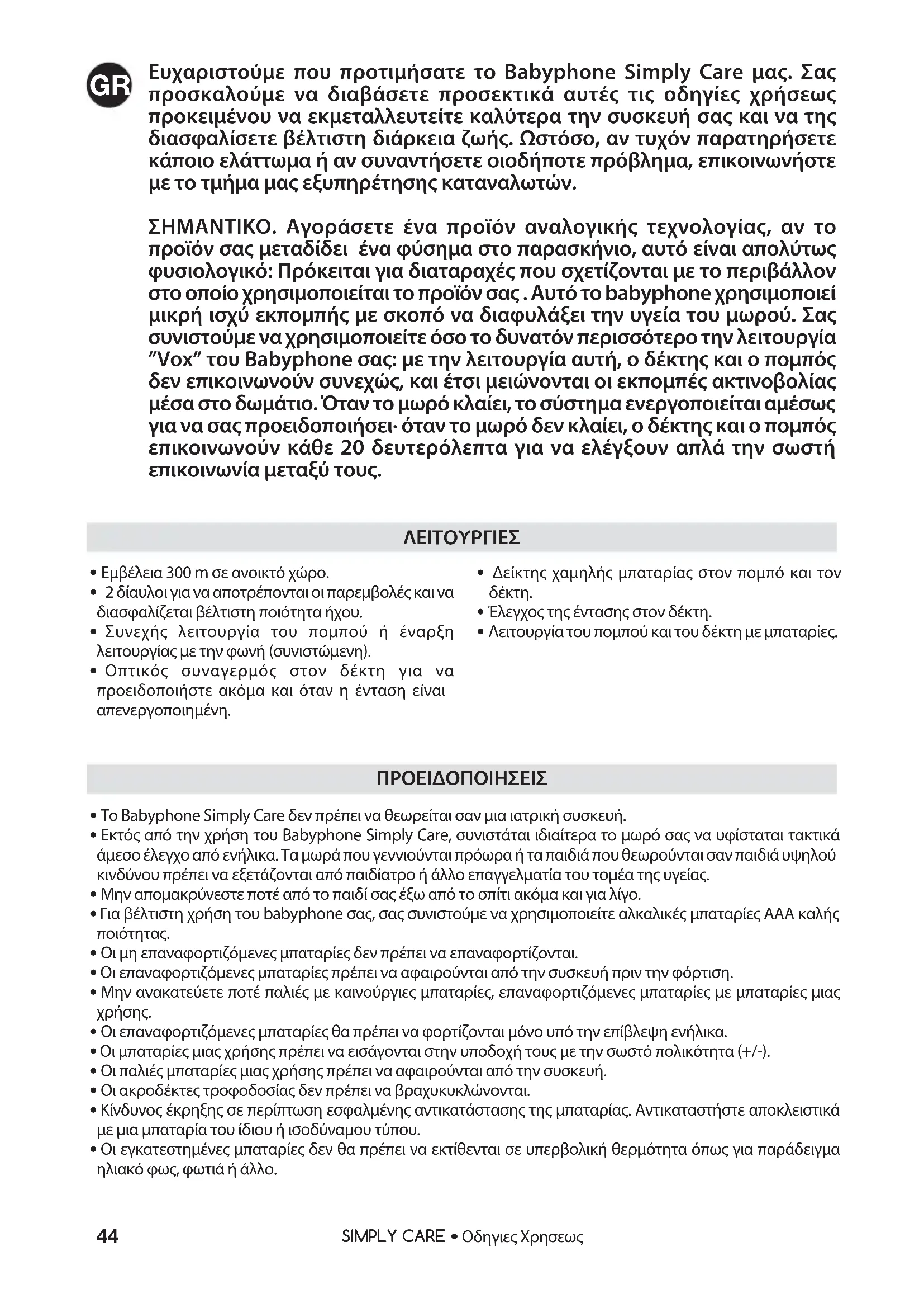 ŘΕμβέλεια 300 m σε ανοικτό χώρο.Ř2 δίαυλοι για να αποτρέπονται οι παρεμβολές και να διασφαλίζεται βέλτιστη ποιότητα ήχου. ŘΣυνεχής λειτουργία του πομπού ή έναρξη λειτουργίας με την φωνή (συνιστώμενη). ŘΟπτικός συναγερμός στον δέκτη για να προειδοποιήστε ακόμα και όταν η ένταση είναι απενεργοποιημένη. ŘΔείκτης χαμηλής μπαταρίας στον πομπό και τον ŘΈλεγχος της έντασης στον δέκτη.ŘΛειτουργία του πομπού και του δέκτη με μπαταρίες. ΛΕΙΤΟΥΡΓΙΕΣ Ř Το Babyphone Simply Care δεν πρέπει να θεωρείται σαν μια ιατρική συσκευή. Ř Εκτός από την χρήση του Babyphone Simply Care, συνιστάται ιδιαίτερα το μωρό σας να υφίσταται τακτικά άμεσο έλεγχο από ενήλικα. Τα μωρά που γεννιούνται πρόωρα ή τα παιδιά που θεωρούνται σαν παιδιά υψηλού κινδύνου πρέπει να εξετάζονται από παιδίατρο ή άλλο επαγγελματία του τομέα της υγείας. Ř Μην απομακρύνεστε ποτέ από το παιδί σας έξω από το σπίτι ακόμα και για λίγο. Ř Για βέλτιστη χρήση του babyphone σας, σας συνιστούμε να χρησιμοποιείτε αλκαλικές μπαταρίες AAA καλής