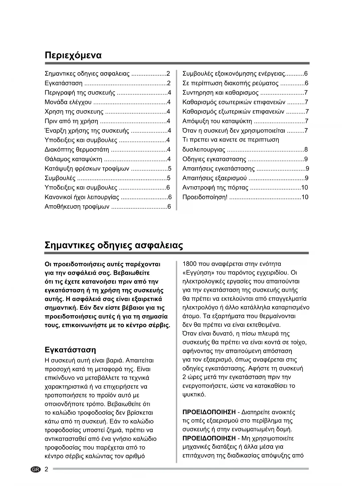- ΠΡΟΕΙΔΟΠΟΙΗΣΗ - Διατηρείτε ανοικτές τις οπές εξαερισμού στο περίβλημα της συσκευής ή στην ενσωματωμένη δομή. ΠΡΟΕΙΔΟΠΟΙΗΣΗ - Μη χρησιμοποιείτε μηχανικές διατάξεις ή άλλα μέσα για επιτάχυνση της διαδικασίας απόψυξης από Σημαντικες οδηγιες ασφαλειας Περιεχόμενα Σημαντικες οδηγιες ασφαλειας p. 2