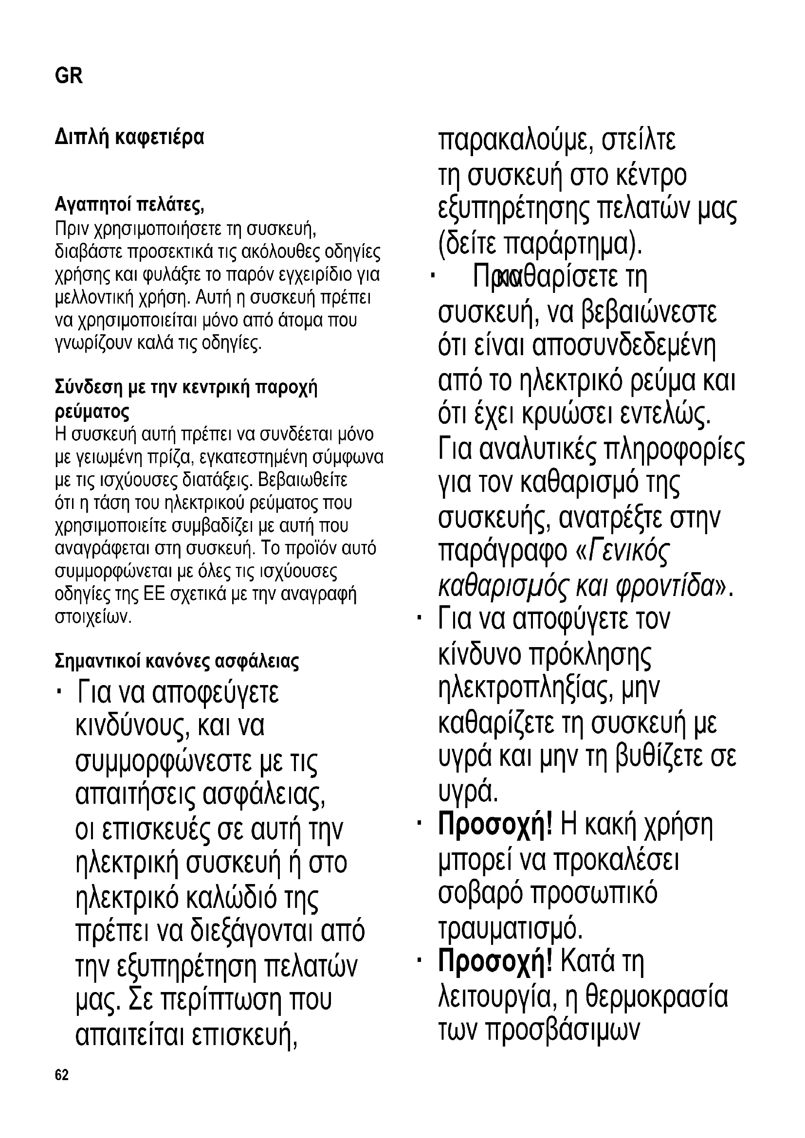 ∙ Προσοχή! Η κακή χρήση μπορεί να προκαλέσει σοβαρό προσωπικό τραυματισμό. ∙ Προσοχή! Κατά τη λειτουργία, η θερμοκρασία των προσβάσιμων GR63 επιφανειών και της εστίας φτάνει σε πολύ υψηλές τιμές και θα παραμένει υψηλή για κάποιο χρόνο μετέπειτα. ∙ Η συσκευή αυτή προορίζεται για οικιακή χρήση ή παρόμοιες χρήσεις, όπως για παράδειγμα: - σε κουζίνες εταιρειών, σε γραφεία και άλλα εργασιακά περιβάλλοντα, - σε γεωργικές εταιρείες, - από πελάτες σε ξενοδοχεία, πανδοχεία κτλ. και παρόμοιες εγκαταστάσεις, - σε ξενώνες που σερβίρουν