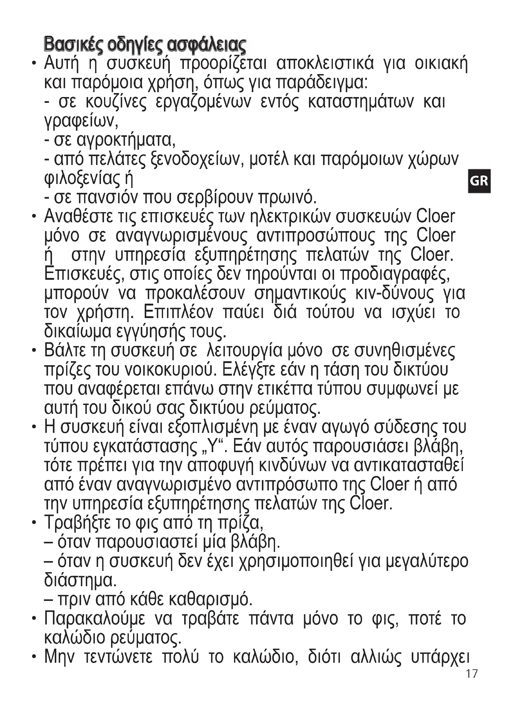- Η σύσκευή είναι εξοπλισμένη με έναν αγωγό σύδεσης του τύπου εγκατάστασης „Υ“. Εάν αυτός παρουσιάσει βλάβη, τότε πρέπει για την αποφυγή κινδύνων να αντικατασταθεί από έναν αναγνωρισμένο αντιπρόσωπο της Cloer ή από την υπηρεσία εξυπηρέτησης πελατών της Cloer.