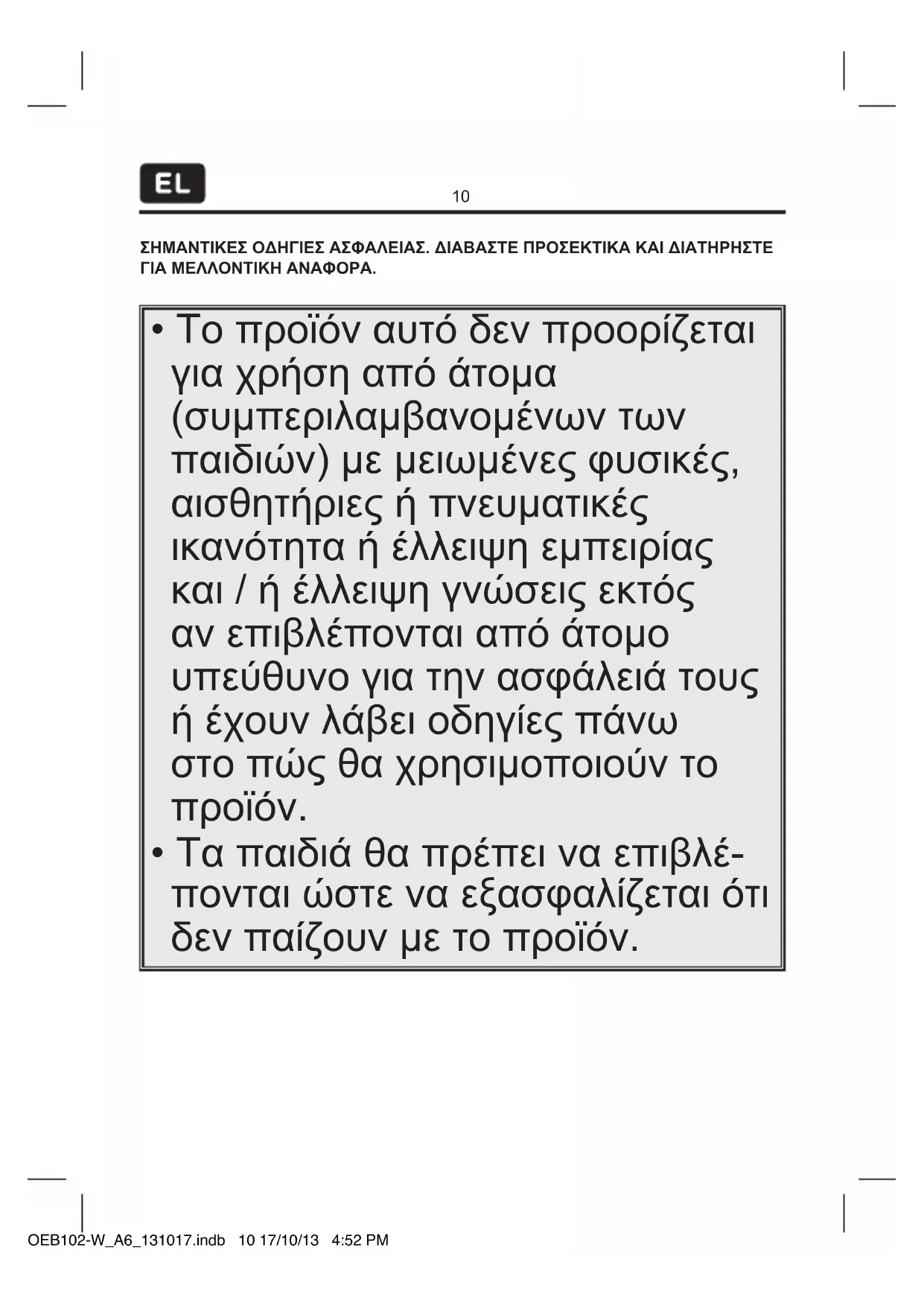 - Ταπαιδιάθαπρέπειναεπιβλέ- πονταιώστεναεξασφαλίζεταιότι δενπαίζουνμετοπροϊόν. OEB102-W_A6_131017.indb 10 17/10/13 4:52 PMSize - A6