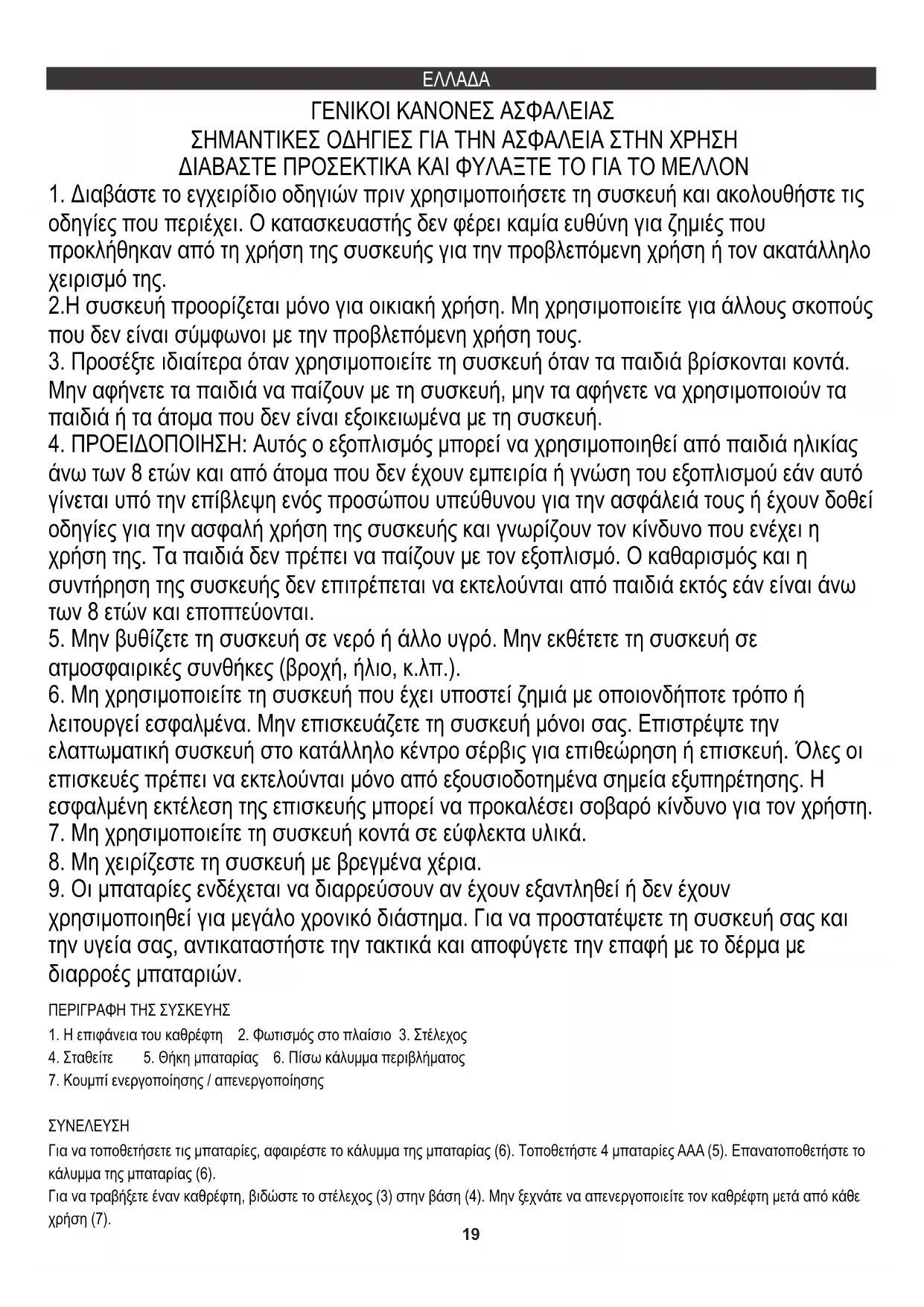 οδηγίες που περιέχει. Ο κατασκευαστής δεν φέρει καμία ευθύνη για ζημιές που προκλήθηκαν από τη χρήση της συσκευής για την προβλεπόμενη χρήση ή τον ακατάλληλο χειρισμό της. 2.Η συσκευή προορίζεται μόνο για οικιακή χρήση. Μη χρησιμοποιείτε για άλλους σκοπούς που δεν είναι σύμφωνοι με την προβλεπόμενη χρήση τους.