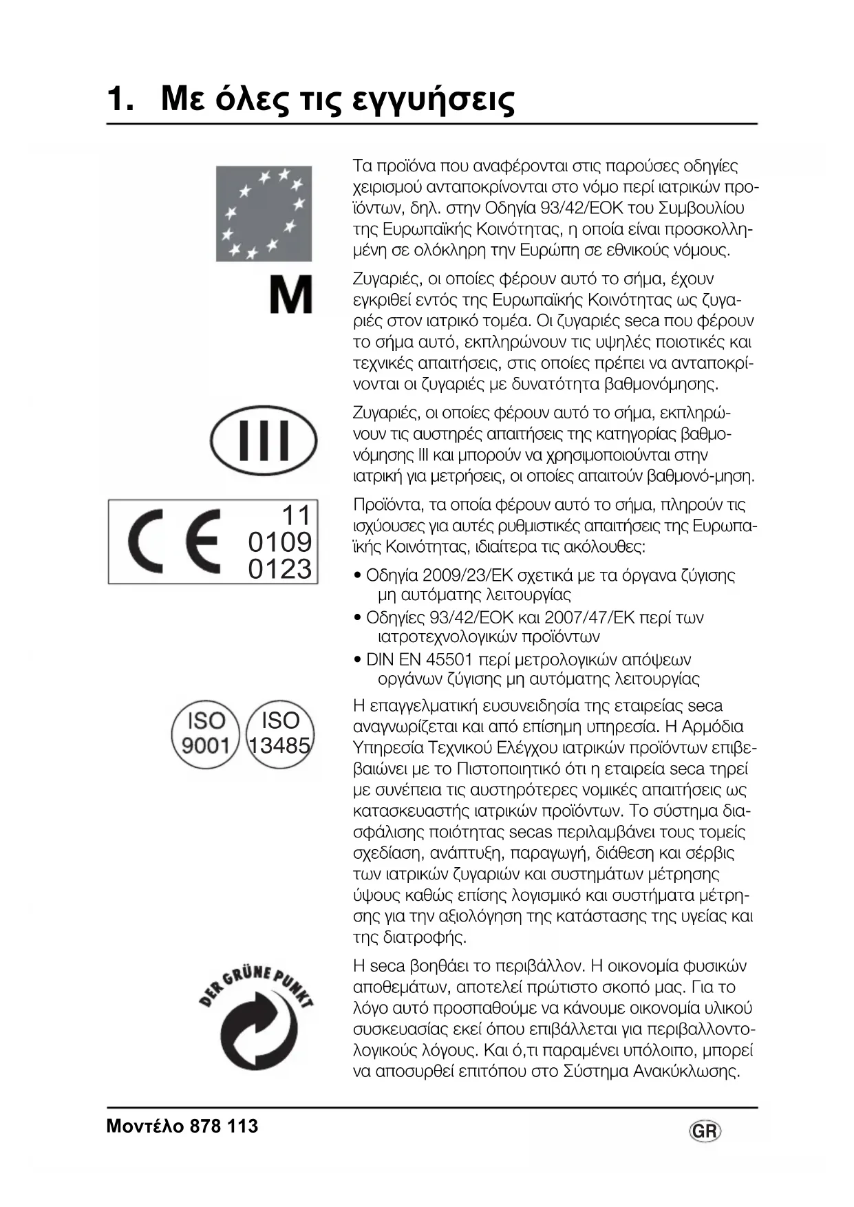 Η επαγγελματική ευσυνειδησία της εταιρείας seca αναγνωρίζεται και από επίσημη υπηρεσία. Η Αρμόδια Υπηρεσία Τεχνικού Ελέγχου ιατρικών προϊόντων επιβεβαιώνει με το Πιστοποιητικό ότι η εταιρεία seca τηρεί με συνέπεια τις αυστηρότερες νομικές απαιτήσεις ως κατασκευαστής ιατρικών προϊόντων. Το σύστημα διασφάλισης ποιότητας secas περιλαμβάνει τους τομείς σχεδίαση, ανάπτυξη, παραγωγή, διάθεση και σέρβις των ιατρικών ζυγαριών και συστημάτων μέτρησης ύψους καθώς επίσης λογισμικό και συστήματα μέτρησης για την αξιολόγηση της κατάστασης της υγείας και της διατροφής.