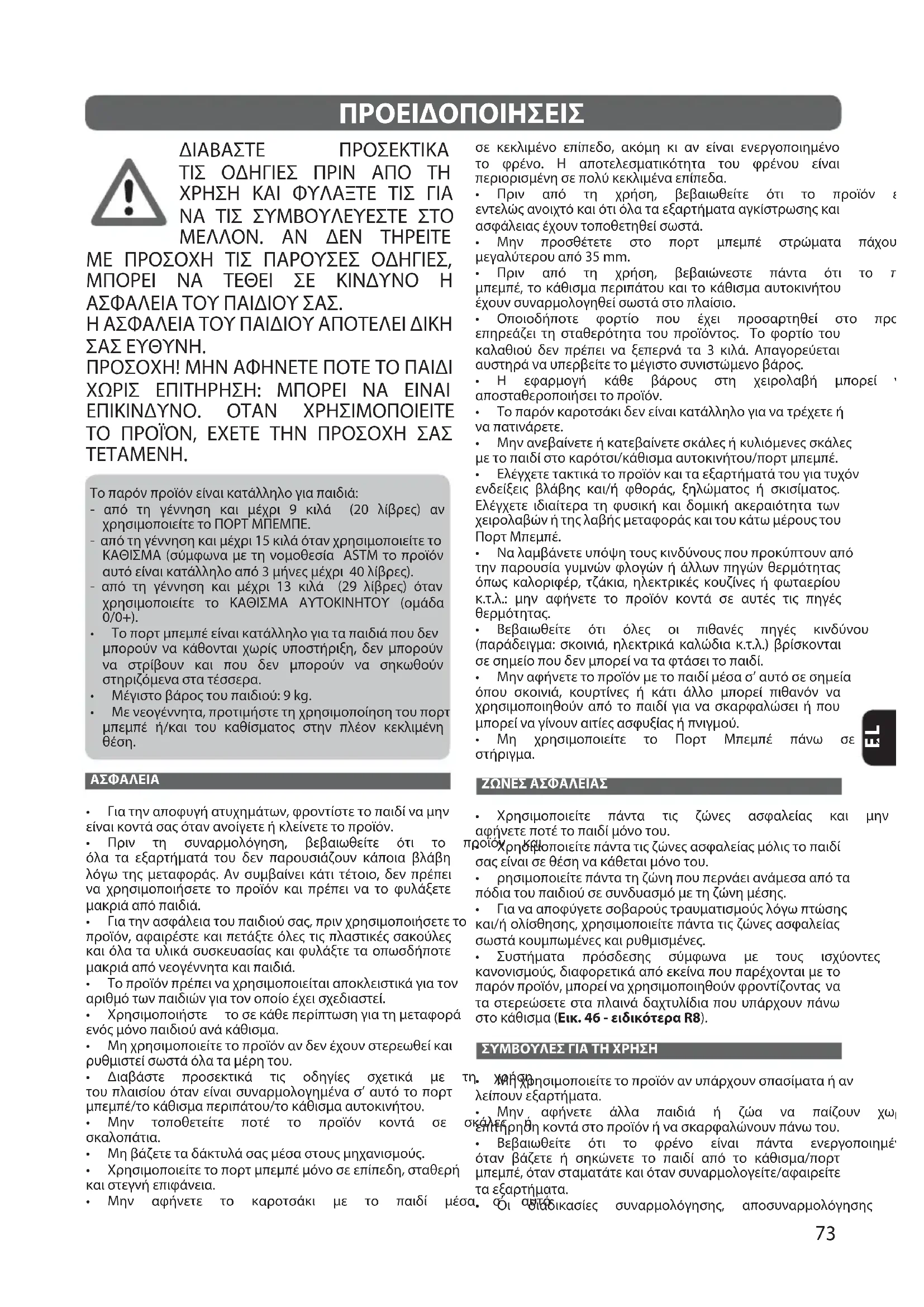 ΖΩΝΕΣ ΑΣΦΑΛΕΙΑΣ t ȮɉɀɊɂɅɈƇɈɂȾɕɋȾ ƇɒɆɋȺ ɋɂɑ ȿɚɆȾɑ ȺɊɍȺɄȾɕȺɑ ɃȺɂ ɅɀɆ αφήνετε ποτέ το παιδί μόνο του. t ȮɉɀɊɂɅɈƇɈɂȾɕɋȾƇɒɆɋȺɋɂɑȿɚɆȾɑȺɊɍȺɄȾɕȺɑɅɗɄɂɑɋɈƇȺɂȽɕ σας είναι σε θέση να κάθεται μόνο του. t ɉɀɊɂɅɈƇɈɂȾɕɋȾƇɒɆɋȺɋɀȿɚɆɀƇɈɌƇȾɉɆɒȾɂȺɆɒɅȾɊȺȺƇɗɋȺ πόδια του παιδιού σε συνδυασμό με τη ζώνη μέσης. t țɂȺɆȺȺƇɈɍɘȼȾɋȾɊɈȻȺɉɈɘɑɋɉȺɌɅȺɋɂɊɅɈɘɑɄɗȼɐƇɋɚɊɀɑ και/ή ολίσθησης, χρησιμοποιείτε πάντα τις ζώνες ασφαλείας σωστά κουμπωμένες και ρυθμισμένες. t ȪɌɊɋɔɅȺɋȺ ƇɉɗɊȽȾɊɀɑ ɊɘɅɍɐɆȺ ɅȾ ɋɈɌɑ ɂɊɎɘɈɆɋȾɑ κανονισμούς, διαφορετικά από εκείνα που παρέχονται με το παρόν προϊόν, μπορεί να χρησιμοποιηθούν φροντίζοντας να τα στερεώσετε στα πλαινά δαχτυλίδια που υπάρχουν πάνω στο κάθισμα (Εικ. 46 - ειδικότερα R8). ΣΥΜΒΟΥΛΕΣ ΓΙΑ ΤΗ ΧΡΗΣΗ t ȤɀɎɉɀɊɂɅɈƇɈɂȾɕɋȾɋɈƇɉɈɖɗɆȺɆɌƇɒɉɎɈɌɆɊƇȺɊɕɅȺɋȺɔȺɆ λείπουν εξαρτήματα. t ȤɀɆ ȺɍɔɆȾɋȾ ɒɄɄȺ ƇȺɂȽɂɒ ɔ ȿɚȺ ɆȺ ƇȺɕȿɈɌɆ Ɏɐɉɕɑ επιτήρηση κοντά στο προϊόν ή να σκαρφαλώνουν πάνω του. t ȚȾȻȺɂɐɁȾɕɋȾ ɗɋɂ ɋɈ ɍɉɓɆɈ ȾɕɆȺɂ ƇɒɆɋȺ ȾɆȾɉȼɈƇɈɂɀɅɓɆɈ όταν βάζετε ή σηκώνετε το παιδί από το κάθισμα/πορτ μπεμπέ, όταν σταματάτε και όταν συναρμολογείτε/αφαιρείτε τα εξαρτήματα. t ȧɂ ȽɂȺȽɂɃȺɊɕȾɑ ɊɌɆȺɉɅɈɄɗȼɀɊɀɑ ȺƇɈɊɌɆȺɉɅɈɄɗȼɀɊɀɑ ΠΡΟΕΙΔΟΠΟΙΗΣΕΙΣ74