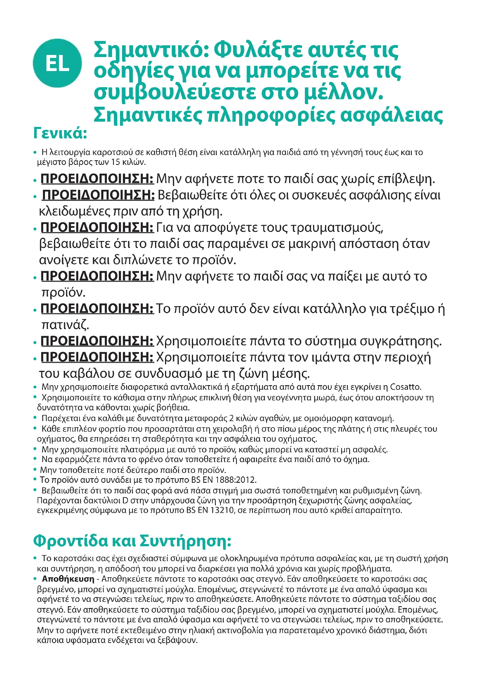Το καροτσάκι σας έχει σχεδιαστεί σύμφωνα με ολοκληρωμένα πρότυπα ασφαλείας και, με τη σωστή χρήση και συντήρηση, η απόδοσή του μπορεί να διαρκέσει για πολλά χρόνια και χωρίς προβλήματα.
