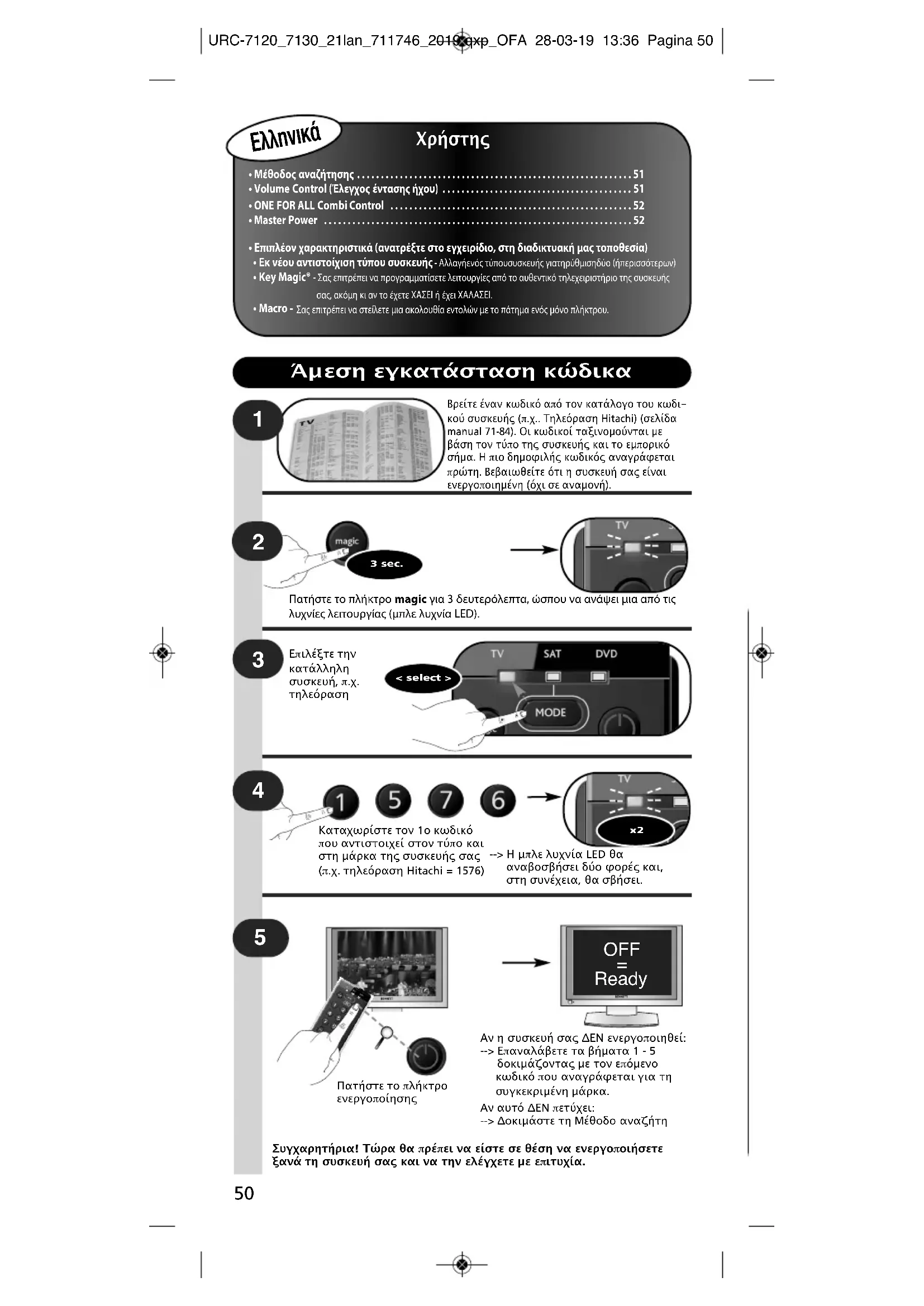 URC-7120_7130_21lan_711746_2019.qxp_OFA 28-03-19 13:36 Pagina 50Η Μέθοδος Αναζήτησης σας επιτρέπει να βρείτε τον κώδικα για τη συσκευή σας ανιχνεύοντας όλους τους κώδικες που περιέχονται στη µνήµη του ONE FOR ALL. Η Μέθοδος Αναζήτησης µπορεί επίσης να βοηθήσει αν η µάρκα της συσκευής σας δεν αναγράφεται καθόλου. Παράδειγµα: Για να αναζητήσετε τον κώδικα της TV: