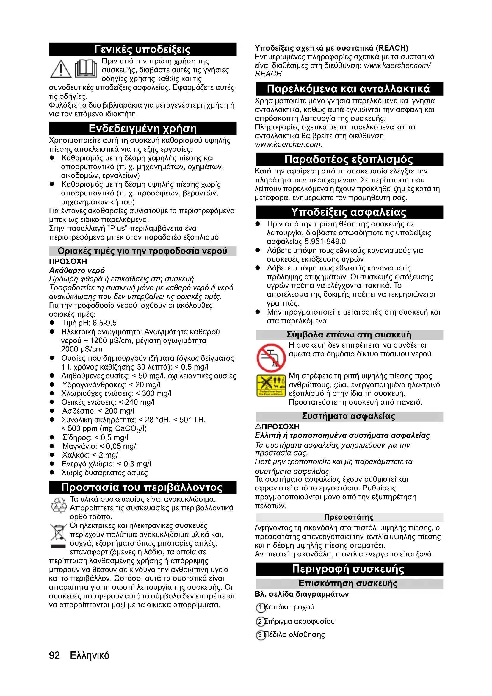 /l) Σίδηρος: < 0,5 mg/l Μαγγάνιο: < 0,05 mg/l Χαλκός: < 2 mg/l Ενεργό χλώριο: < 0,3 mg/l Χωρίς δυσάρεστες οσμές Προστασία του περιβάλλοντος Τα υλικά συσκευασίας είναι ανακυκλώσιμα. Απορρίπτετε τις συσκευασίες με περιβαλλοντικά ορθό τρόπο. Οι ηλεκτρικές και ηλεκτρονικές συσκευές περιέχουν πολύτιμα ανακυκλώσιμα υλικά και, συχνά, εξαρτήματα όπως μπαταρίες απλές, επαναφορτιζόμενες ή λάδια, τα οποία σε περίπτωση λανθασμένης χρήσης ή απόρριψης μπορούν να θέσουν σε κίνδυνο την ανθρώπινη υγεία και το περιβάλλον. Ωστόσο, αυτά τα συστατικά είναι απαραίτητα για τη σωστή λειτουργία της συσκευής. Οι συσκευές που φέρουν αυτό το σύμβολο δεν επιτρέπεται να απορρίπτονται μαζί με τα οικιακά απορρίμματα. Υποδείξεις σχετικά με συστατικά (REACH) Ενημερωμένες πληροφορίες σχετικά με τα συστατικά είναι διαθέσιμες στη διεύθυνση: www.kaercher.com/ REACH Παρελκόμενα και ανταλλακτικά Χρησιμοποιείτε μόνο γνήσια παρελκόμενα και γνήσια ανταλλακτικά, καθώς αυτά εγγυώνται την ασφαλή και απρόσκοπτη λειτουργία της συσκευής. Πληροφορίες σχετικά με τα παρελκόμενα και τα ανταλλακτικά θα βρείτε στη διεύθυνση www.kaercher.com. Παραδοτέος εξοπλισμός Κατά την αφαίρεση από τη συσκευασία ελέγξτε την πληρότητα των περιεχομένων. Σε περίπτωση που λείπουν παρελκόμενα ή έχουν προκληθεί ζημιές κατά τη μεταφορά, ενημερώστε τον προμηθευτή σας. Υποδείξεις ασφαλείας Πριν από την πρώτη θέση της συσκευής σε λειτουργία, διαβάστε οπωσδήποτε τις υποδείξεις ασφαλείας 5.951-949.0. Λάβετε υπόψη τους εθνικούς κανονισμούς για συσκευές εκτόξευσης υγρών. Λάβετε υπόψη τους εθνικούς κανονισμούς πρόληψης ατυχημάτων. Οι συσκευές εκτόξευσης υγρών πρέπει να ελέγχονται τακτικά. Το αποτέλεσμα της δοκιμής πρέπει να τεκμηριώνεται