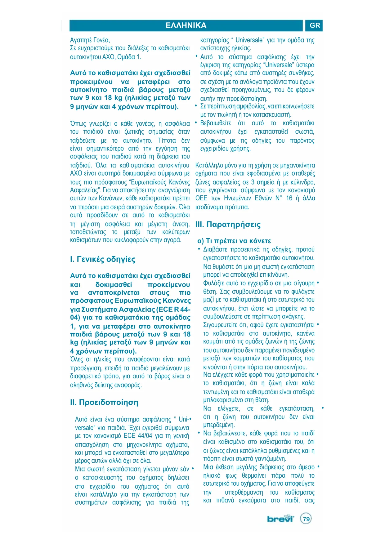 α) Τι πρέπει να κάνετε Διαβάστε προσεκτικά τις οδηγίες, προτού • εγκαταστήσετε το καθισματάκι αυτοκινήτου. Να θυμάστε ότι μια μη σωστή εγκατάσταση μπορεί να αποδειχθεί επικίνδυνη. Φυλάξτε αυτό το εγχειρίδιο σε μια σίγουρη • θέση. Σας συμβουλεύουμε να το φυλάγετε μαζί με το καθισματάκι ή στο εσωτερικό του αυτοκινήτου, έτσι ώστε να μπορείτε να το συμβουλεύεστε σε περίπτωση ανάγκης. Σιγουρευτείτε ότι, αφού έχετε εγκαταστήσει • το καθισματάκι στο αυτοκίνητο, κανένα κομμάτι από τις ομάδες ζωνών ή της ζώνης του αυτοκινήτου δεν παραμένει παγιδευμένο μεταξύ των κομματιών του καθίσματος που κινούνται ή στην πόρτα του αυτοκινήτου. Να ελέγχετε κάθε φορά που χρησιμοποιείτε • το καθισματάκι, ότι η ζώνη είναι καλά τεντωμένη και το καθισματάκι είναι σταθερά μπλοκαρισμένο στη θέση. Να ελέγχετε, σε κάθε εγκατάσταση, • ότι η ζώνη του αυτοκινήτου δεν είναι μπερδεμένη. Να βεβαιώνεστε, κάθε φορά που το παιδί • είναι καθισμένο στο καθισματάκι του, ότι οι ζώνες είναι κατάλληλα ρυθμισμένες και η πόρπη είναι σωστά γαντζωμένη. Μια έκθεση μεγάλης διάρκειας στο άμεσο • ηλιακό φως θερμαίνει πάρα πολύ το εσωτερικό του οχήματος. Για να αποφεύγετε την υπερθέρμανση του καθίσματος και πιθανά εγκαύματα στο παιδί, σας80 στο καθισματάκι, ούτε στο εσωτερικό του