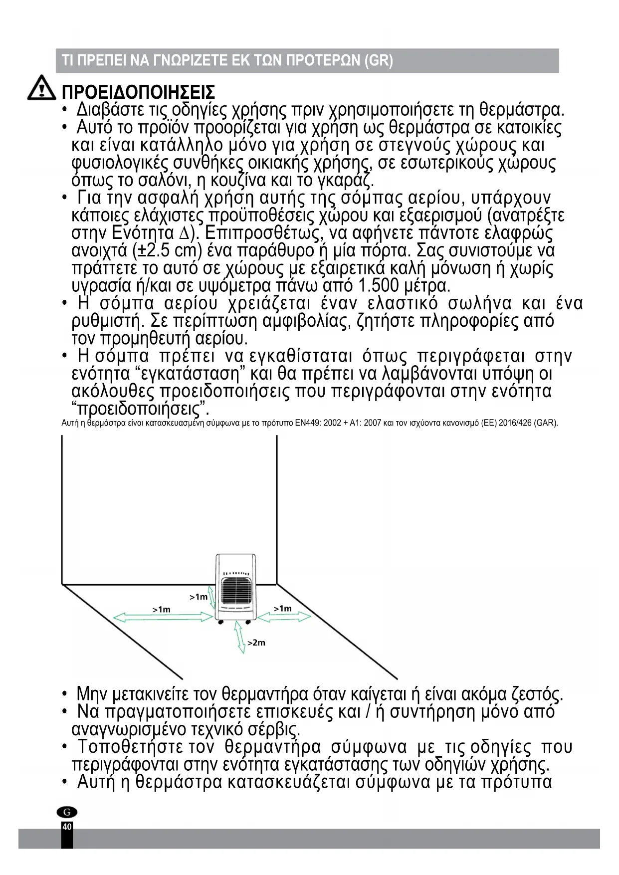 - Αυτή η θερμάστρα κατασκευάζεται σύμφωνα με τα πρότυπα >1m >1m >2m >1m41 ασφαλείας CE. Παρόλα αυτά, όπως και με οποιαδήποτε άλλη συσκευή θέρμανσης, πρέπει να προσέχετε.
