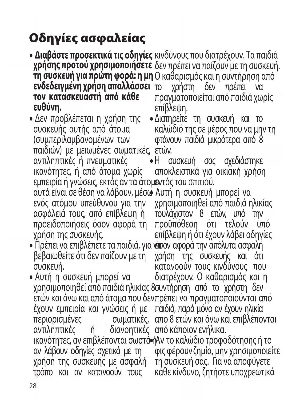 - Αυτή η συσκευή μπορεί να χρησιμοποιηθεί από παιδιά ηλικίας τουλάχιστον 8 ετών, υπό την προϋπόθεση ότι τελούν υπό επίβλεψη ή ότι έχουν λάβει οδηγίες όσον αφορά την απόλυτα ασφαλή χρήση της συσκευής και ότι κατανοούν τους κινδύνους που διατρέχουν. Ο καθαρισμός και η συντήρηση από το χρήστη δεν πρέπει να πραγματοποιούνται από παιδιά, παρά μόνο αν έχουν ηλικία από 8 ετών και άνω και επιβλέπονται από κάποιον ενήλικα.