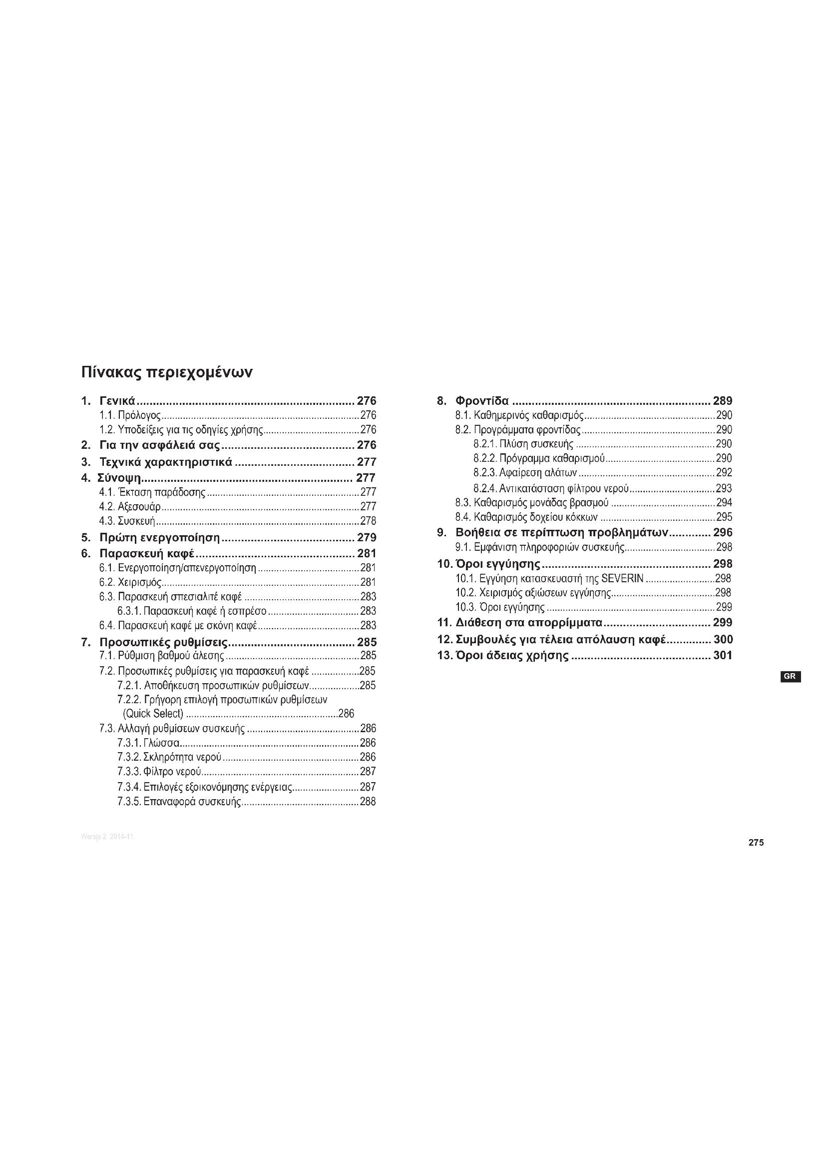 - Η εγγύηση δεν καλύπτει βλάβες και ελαττώματα που ενδέχεται να προκύψουν λόγω ακατάλληλης χρήσης, ακατάλληλης ηλεκτρικής σύνδεσης, προσπάθειες επιδιόρθωσης από μη εξουσιοδοτημένα πρόσωπα ή αδυναμία συμμόρφωσης με τις οδηγίες χρήσης. Επίσης, η εγγύηση δεν ισχύει σε περίπτωση μη εφαρμογής των οδηγιών χρήσης και συντήρησης της SEVERIN ή/και χρήσης υλικών (φίλτρα νερού, καθαριστικά) που δεν συμμορφώνονται με τις αρχικές προδιαγραφές. Η εγγύηση δεν καλύπτει τα μέρη που υπόκεινται σε φθορά (π.χ. πώματα, δίσκους άλεσης, βαλβίδες), ή βλάβες του μηχανισμού άλεσης που ενδέχεται να προκληθούν από ξένα αντικείμενα (π.χ. πέτρες, συνδετήρες), ή βλάβες που ενδέχεται να προκληθούν από ατυχήματα, κεραυνούς, νερό ή φωτιά, ανεπαρκή εξαερισμό, ή άλλες βλάβες που δεν ελέγχονται από τη SEVERIN.