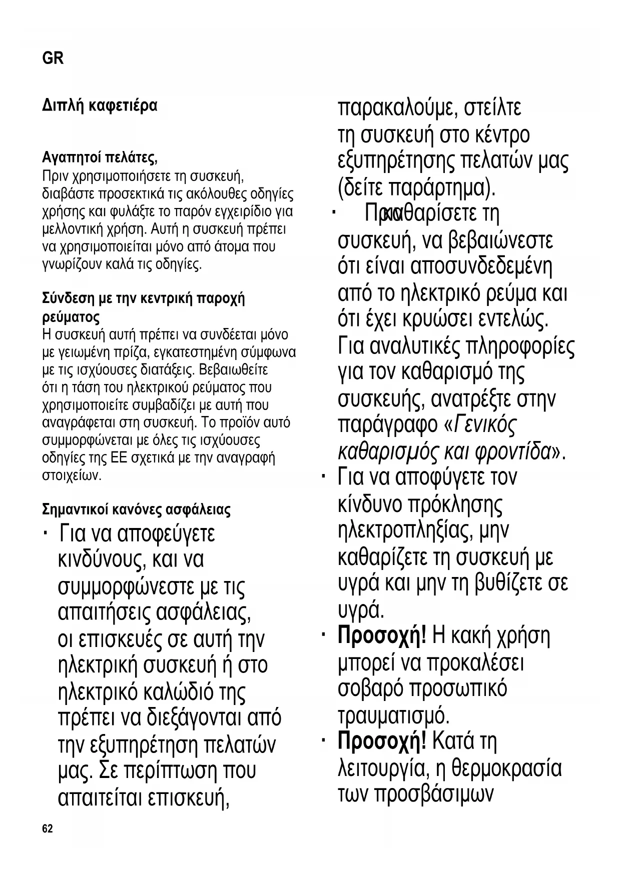 των 8 ετών. ∙ Τα παιδιά δεν πρέπει να επιτρέπεται να παίζουν με τη συσκευή. ∙ Προσοχή! Τα παιδιά πρέπει να παραμένουν μακριά από τα υλικά συσκευασίας, επειδή είναι δυνητικώς επικίνδυνα, π.χ. κίνδυνος ασφυξίας. ∙ Κάθε φορά που χρησιμοποιείτε τη συσκευή, θα πρέπει να ελέγχετε προσεκτικά την κύρια μονάδα, το ηλεκτρικό καλώδιο, καθώς και κάθε εξάρτημα για τυχόν ελαττώματα. Αν η συσκευή, για παράδειγμα, έχει πέσει σε σκληρή επιφάνεια ή έχει ασκηθεί64 υπερβολική δύναμη για το τράβηγμα του ηλεκτρικού καλωδίου δεν θα πρέπει να χρησιμοποιηθεί ξανά, ακόμη κι αν η ζημιά δεν φαίνεται ότι μπορεί να προκαλέσει προβλήματα στην ασφαλή λειτουργία της συσκευής. ∙ Κατά τη λειτουργία, η καφετιέρα πρέπει να βρίσκεται τοποθετημένη σε επίπεδη, αντιολισθητική επιφάνεια που δεν θα καταστραφεί από πιτσιλιές και λεκέδες. ∙ Φροντίζετε η συσκευή και το ηλεκτρικό καλώδιο να μην έρχονται σε επαφή με θερμές επιφάνειες ή οποιαδήποτε πηγή θερμότητας. ∙ Μην αφήνετε το ηλεκτρικό καλώδιο να περιφέρεται ελεύθερο. Το καλώδιο πρέπει να διατηρείται μακριά από τα θερμά μέρη της συσκευής. ∙ Να βγάζετε πάντα το φις του ηλεκτρικού καλωδίου από την πρίζα - σε περίπτωση δυσλειτουργίας, - μετά τη χρήση, και επίσης, - πριν το καθαρισμό της συσκευής. ∙ Όταν βγάζετε το φις του ηλεκτρικού καλωδίου από την πρίζα, ποτέ μην τραβάτε το ηλεκτρικό καλώδιο. Να πιάνετε πάντα το ίδιο το φις. ∙ Για να αποφύγετε τον κίνδυνο έκλυσης ζεστού νερού ή ατμού, να σβήνετε πάντα την καφετιέρα και να την αφήνετε να κρυώσει πριν ανοίξετε το καπάκι ή απομακρύνετε οποιαδήποτε αξεσουάρ ή