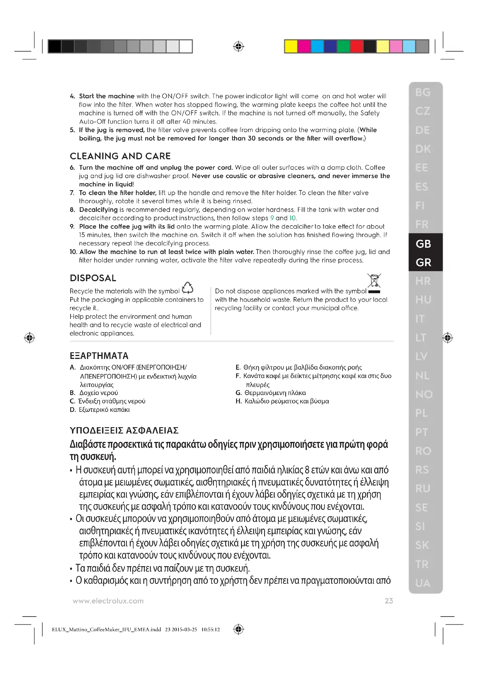 - Ο καθαρισμός και η συντήρηση από το χρήστη δεν πρέπει να πραγματοποιούνται από ELUX_Mattino_CoffeeMaker_IFU_EMEA.indd 23 2015-03-25 10:55:1224 www.electrolux.com