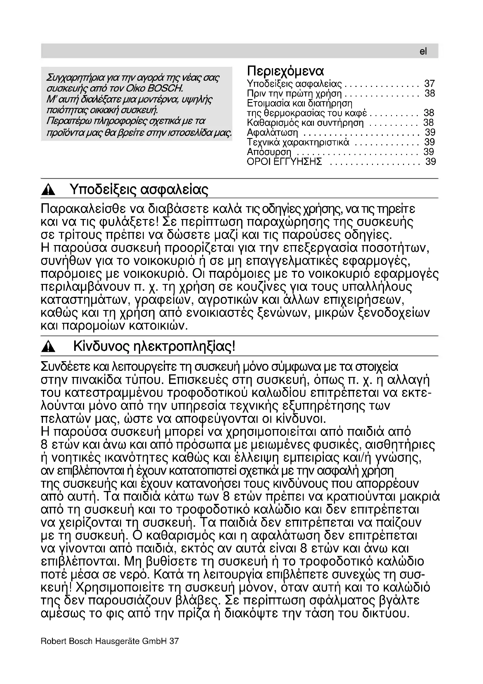 Συγχαρητήρια για την αγορά της νέας σας συσκευής από τον Oίκο BOSCH. Μ’ αυτή διαλέξατε μια μοντέρνα, υψηλής ποιότητας οικιακή συσκευή. Περαιτέρω πληροφορίες σχετικά με τα προϊόντα μας θα βρείτε στην ιστοσελίδα μας.38 Robert Bosch Hausgeräte GmbH , Κίνδυνος εγκαυμάτων και πυρκαγιάς! Κατά τη λειτουργία πιάνετε τα μέρη της συσκευής και τη γυάλινη κανάτα μόνο στις λαβές που έχουν προβλεφθεί γι’ αυτό. Μην αφήνετε τη συσκευή επάνω ή κοντά σε καυτές επιφάνειες, όπως π. χ. εστίες κουζίνας. Μην καλύπτετε ποτέ την επιφάνεια απόθεσης της κανάτας. , Κίνδυνος ασφυξίας! Μην αφήνετε τα παιδιά να παίζουν με τα υλικά συσκευασίας. Σ' αυτές τις οδηγίες χρήσης περιγράφονται διάφορα μοντέλα: – Βασικό μοντέλο (Εικόνα 6a) μόνο με διακόπτη On/Off,– Το μοντέλο (Εικόνα 6b) έχει έναν επι-πλέον διακόπτη για επιλογή φλιτζανιών,Όλα τα μοντέλα είναι προγραμματισμένα με αυτόματη απενεργοποίηση ”auto off” (εξοικονόμηση ενέργειας), η οποία θέτει τη συσκευή μετά από περ. 40 λεπτά εκτός λειτουργίας. Πριν την πρώτη χρήση Αφήστε να περάσουν από τη συσκευή δύο φορές 9 φλιτζάνια νερό (χωρίς καφέ), για να καθαριστεί η συσκευή. Ενδεχομένως μπορεί να παρουσιαστεί μια ακίνδυνη ελαφριά οσμή στη συσκευή λόγω του ότι είναι καινούργια.Στην περίπτωση αυτή αφήνετε να περάσει ένα αραιό διάλυμα ξιδιού (2 φλιτζάνια ξίδι προς 6 φλιτζάνια νερό), στη συνέχεια δύο φορές 9 φλιτζάνια νερό. Ετοιμασία και διατήρηση της θερμοκρασίας του καφέ Εικόνα 1 έως 5Γεμίζετε το δοχείο νερού μόνο με καθαρό νερό και σε καμιά περίπτωση με γάλα ή έτοιμα ποτά όπως τσάι ή καφές! (Αλλοίωση γεύσης του καφέ στις επόμενες χρήσεις.) Τοποθετήστε το φίλτρο 1x4 μέσα στη συγκράτηση φίλτρου.Χρησιμοποιείτε μέτρια αλεσμένο καφέ (συνιστούμε περ. 7 g για κάθε φλιτζάνι). Για λιγότερα φλιτζάνια χρησιμοποιείτε λίγο περισσότερο καφέ απ' ότι για μεγαλύτερο αριθμό φλιτζανιών.Εκχυλίζετε τουλάχιστον 3 μεγάλα φλιτζάνια καφέ, γιατί διαφορετικά ο καφές δεν έχει την επιθυμητή θερμοκρασία ούτε είναι τόσο δυνατός όσο επιθυμείτε.= περ. 125 ml = περ. 85 mlΗ πλάκα διατήρησης θερμοκρασίας παραμένει ζεστή για ακόμα κάποιο διάστημα και μετά τη λήξη της λειτουργίας.Δεν επιτρέπεται να ξαναγεμίσετε την καφε-τιέρα με νερό, αν αυτή δεν κρυώσει πρώτα 5 λεπτά.Κατά τον ίδιο τρόπο μπορεί να ετοιμαστεί και τσάι. Διακόπτης για την επιλογή αριθμού
