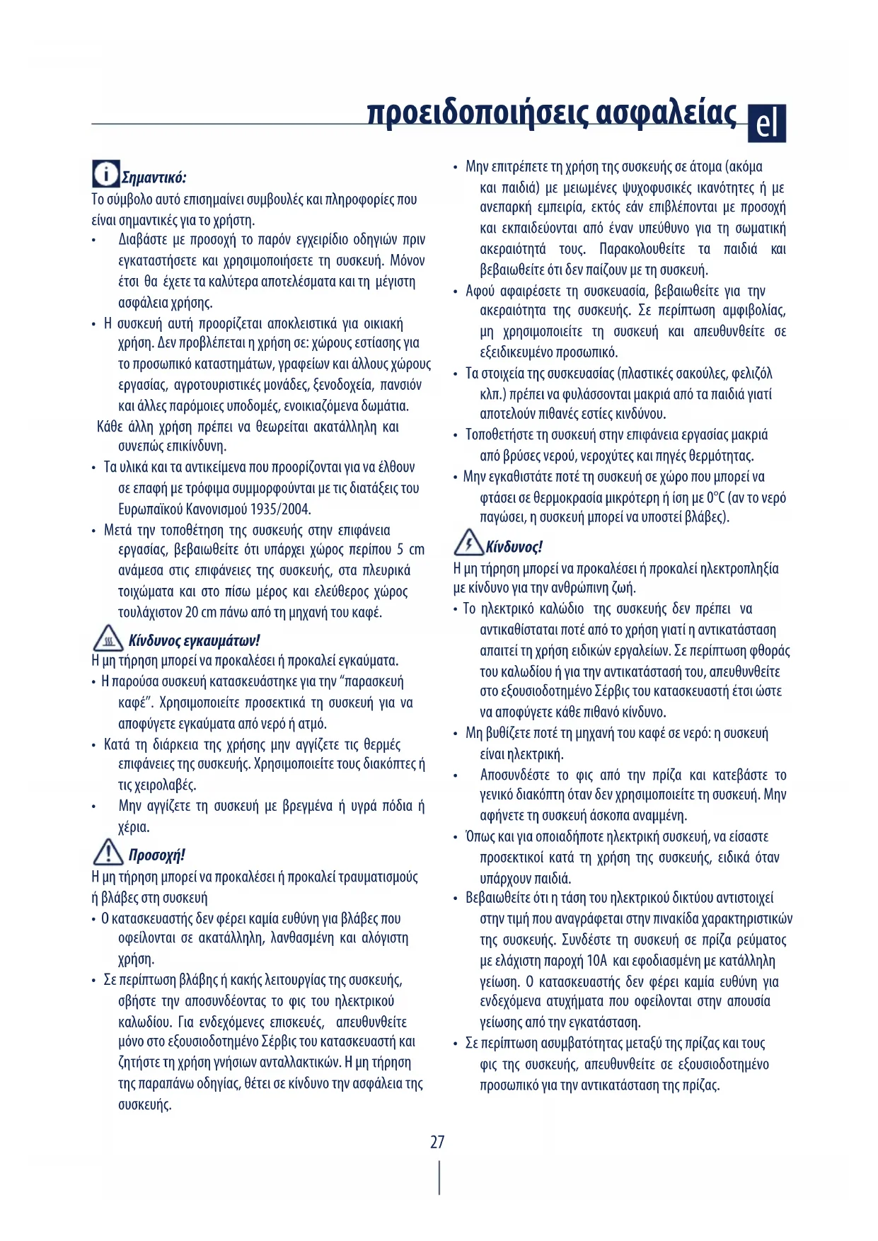 - Η παρούσα συσκευή κατασκευάστηκε για την “παρασκευή καφέ”. Χρησιμοποιείτε προσεκτικά τη συσκευή για να αποφύγετε εγκαύματα από νερό ή ατμό.