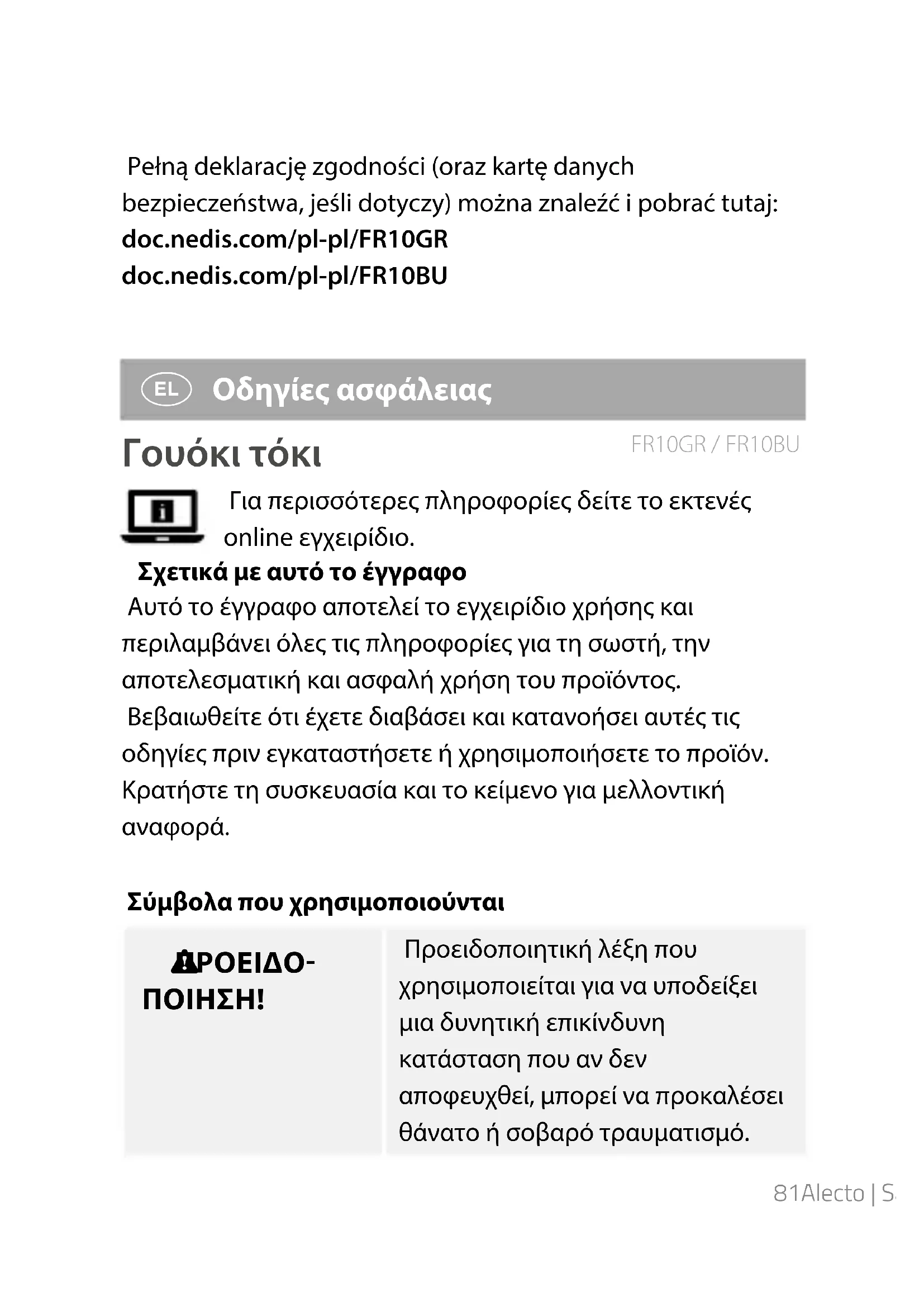 Δήλωση συμμόρφωσης Εμείς, η Commaxx B.V., δηλώνουμε ως κατασκευαστής ότι το προϊόν FR10GR της μάρκας μας Alecto, που παράγεται στην Κίνα, έχει δοκιμαστεί σύμφωνα με όλα τα σχετικά πρότυπα και κανονισμούς CE και ότι όλες οι δοκιμές έχουν ολοκληρωθεί με επιτυχία. Αυτό περιλαμβάνει, μεταξύ άλλων, τον κανονισμό RED 2014/53/ΕΕ. Το πλήρες κείμενο της δήλωσης συμμόρφωσης (και το δελτίο ασφάλεια όπου ισχύει) υπάρχει και είναι διαθέσιμο προς λήψη
