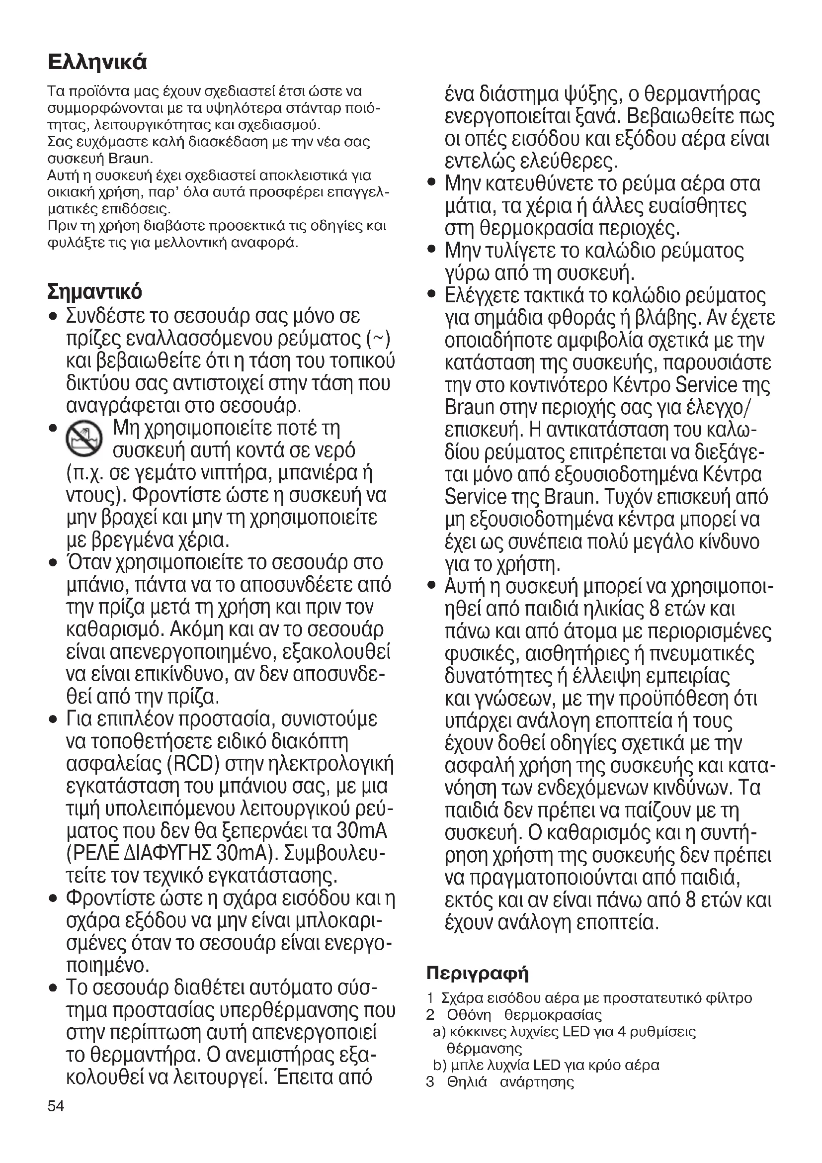 Το σεσουάρ διαθέτει αυτόματο σύσ- τημα προστασίας υπερθέρμανσης που στην περίπτωση αυτή απενεργοποιεί το θερμαντήρα. Ο ανεμιστήρας εξα- κολουθεί να λειτουργεί. Έπειτα από ένα διάστημα ψύξης, ο θερμαντήρας ενεργοποιείται ξανά. Βεβαιωθείτε πως οι οπές εισόδου και εξόδου αέρα είναι εντελώς ελεύθερες.
