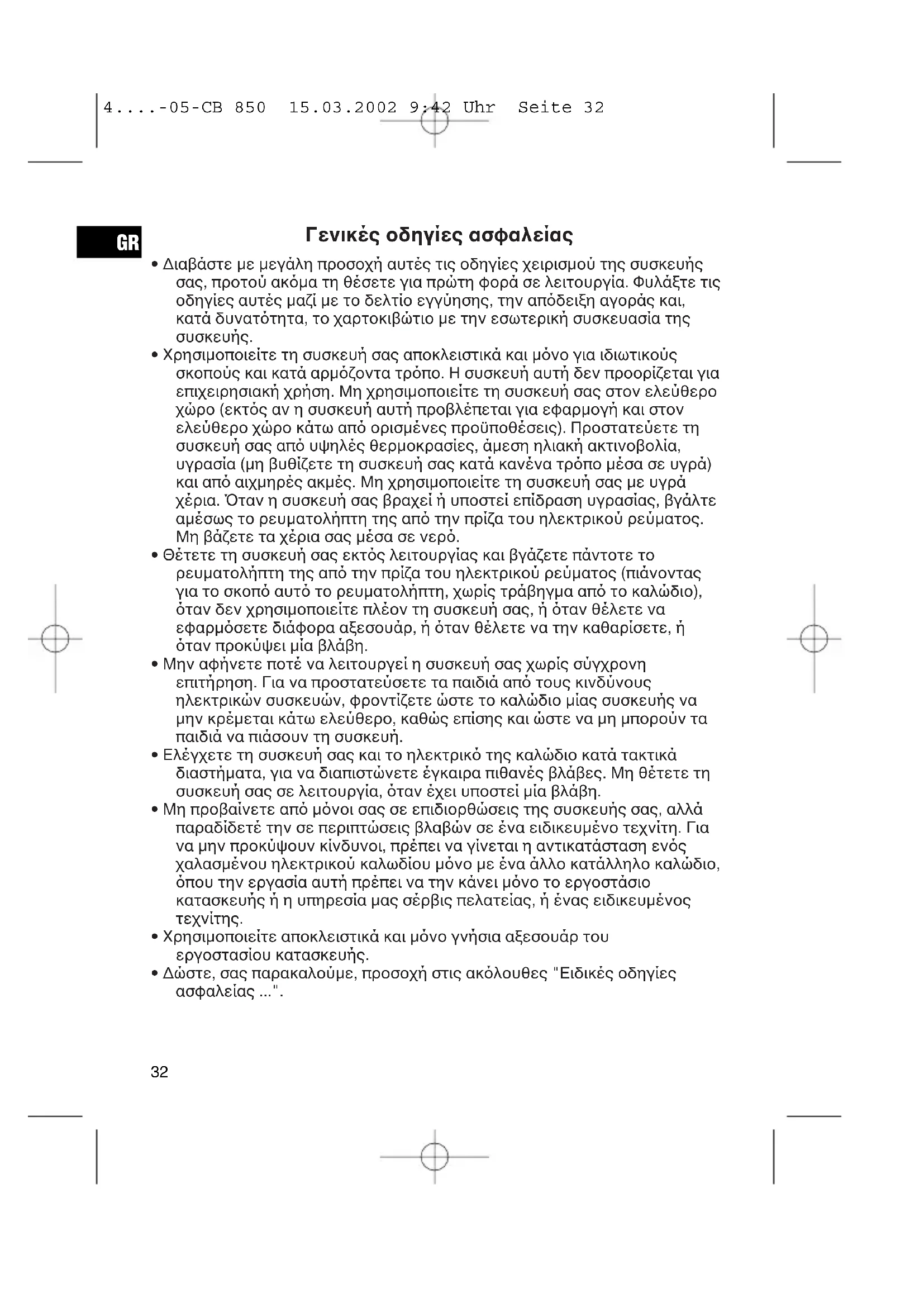 - ∆ώστε, σας παρακαλούµε, προσοχή στις ακ$λουθες "Ειδικές οδηγίες ασφαλείας ...". 4....-05-CB 850 15.03.2002 9:42 Uhr Seite 3233