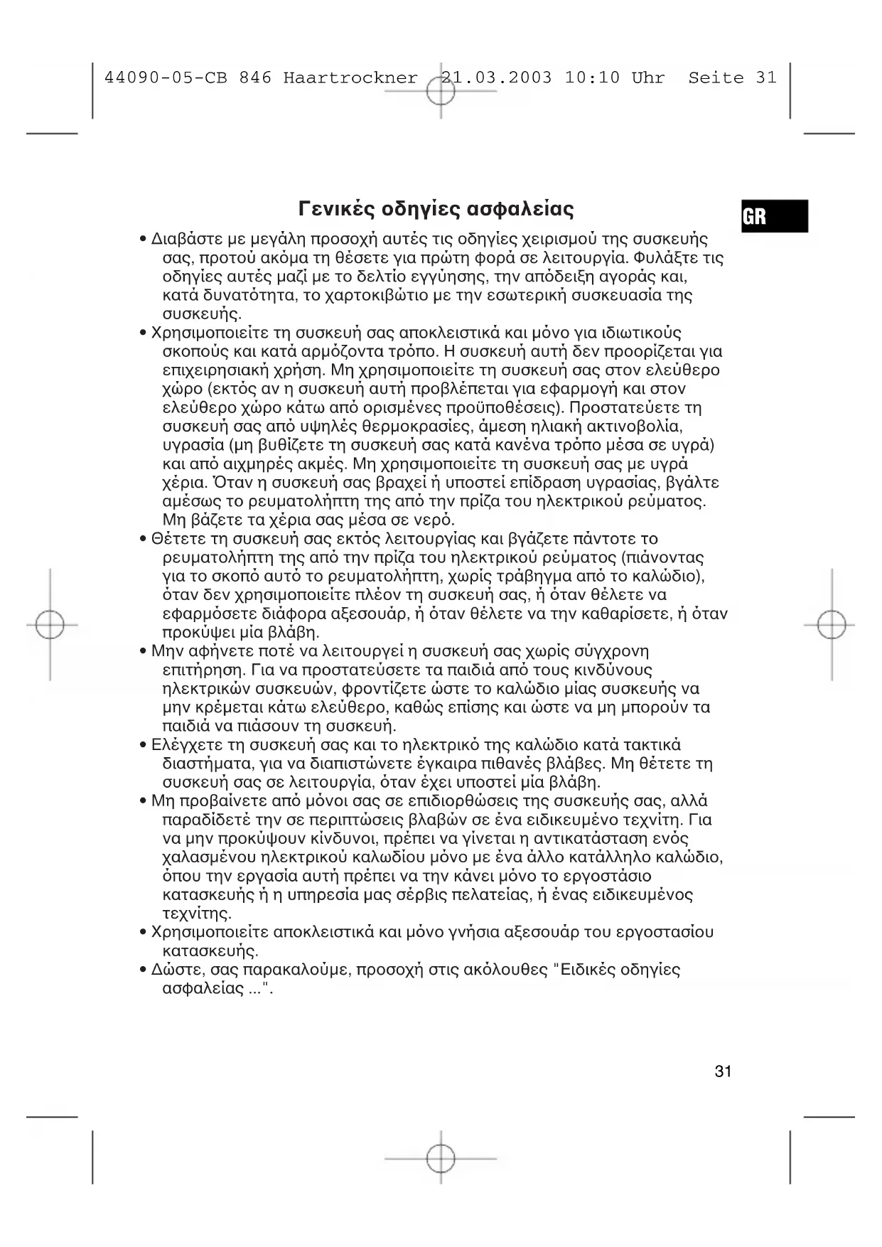 - ∆ώστε, σας παρακαλούµε, προσοχή στις ακ$λουθες "Ειδικές οδηγίες ασφαλείας ...". 44090-05-CB 846 Haartrockner 21.03.2003 10:10 Uhr Seite 3132