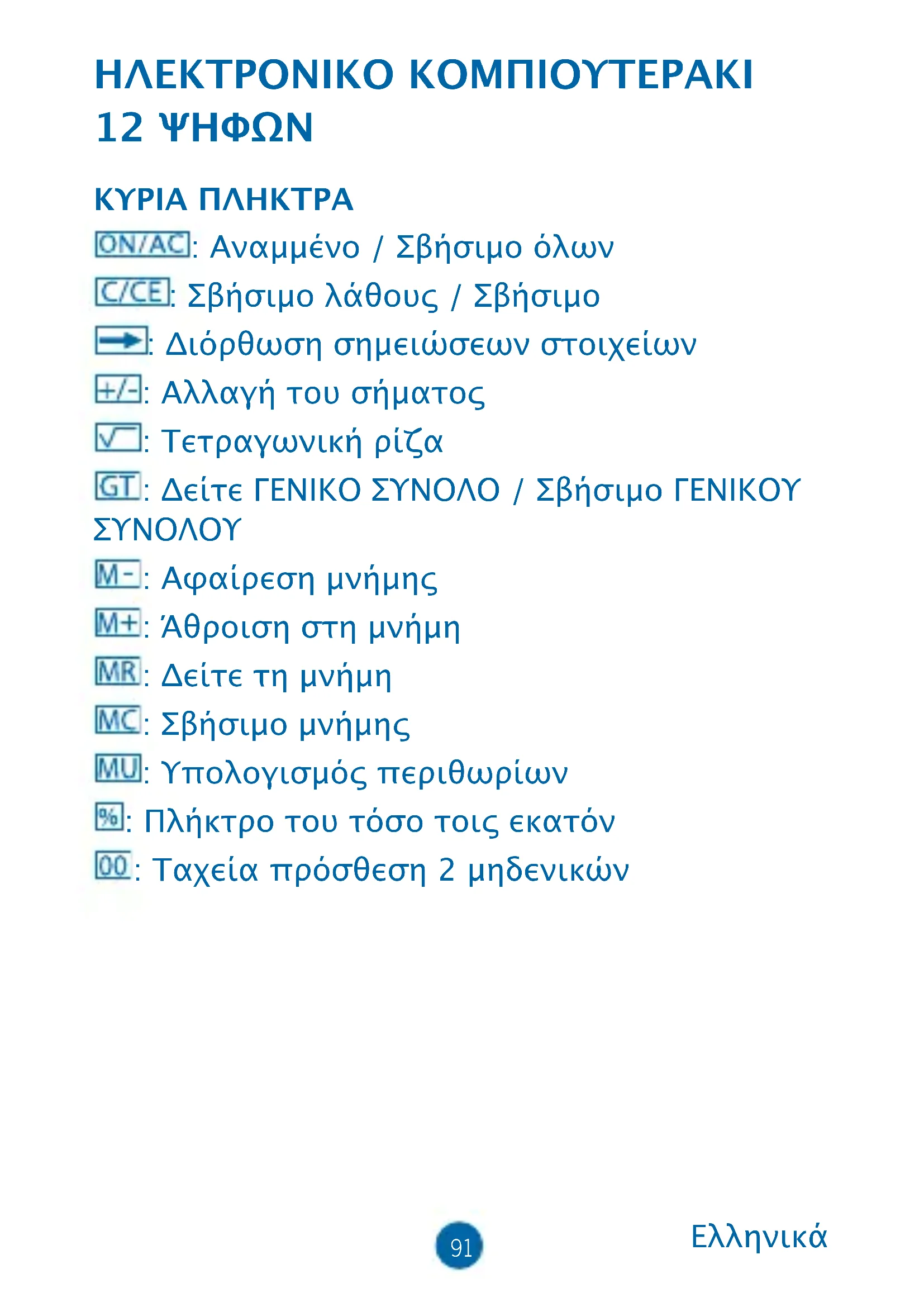 ΗΛΕΚΤΡΟΝΙΚΟ ΚΟΜΠΙΟΥΤΕΡΑΚΙ 12 ΨΗΦΩΝ ΚΥΡΙΑ ΠΛΗΚΤΡΑ : Αναμμένο / Σβήσιμο όλων : Σβήσιμο λάθους / Σβήσιμο : Διόρθωση σημειώσεων στοιχείων : Αλλαγή του σήματος : Τετραγωνική ρίζα : Δείτε ΓΕΝΙΚΟ ΣΥΝΟΛΟ / Σβήσιμο ΓΕΝΙΚΟΥ