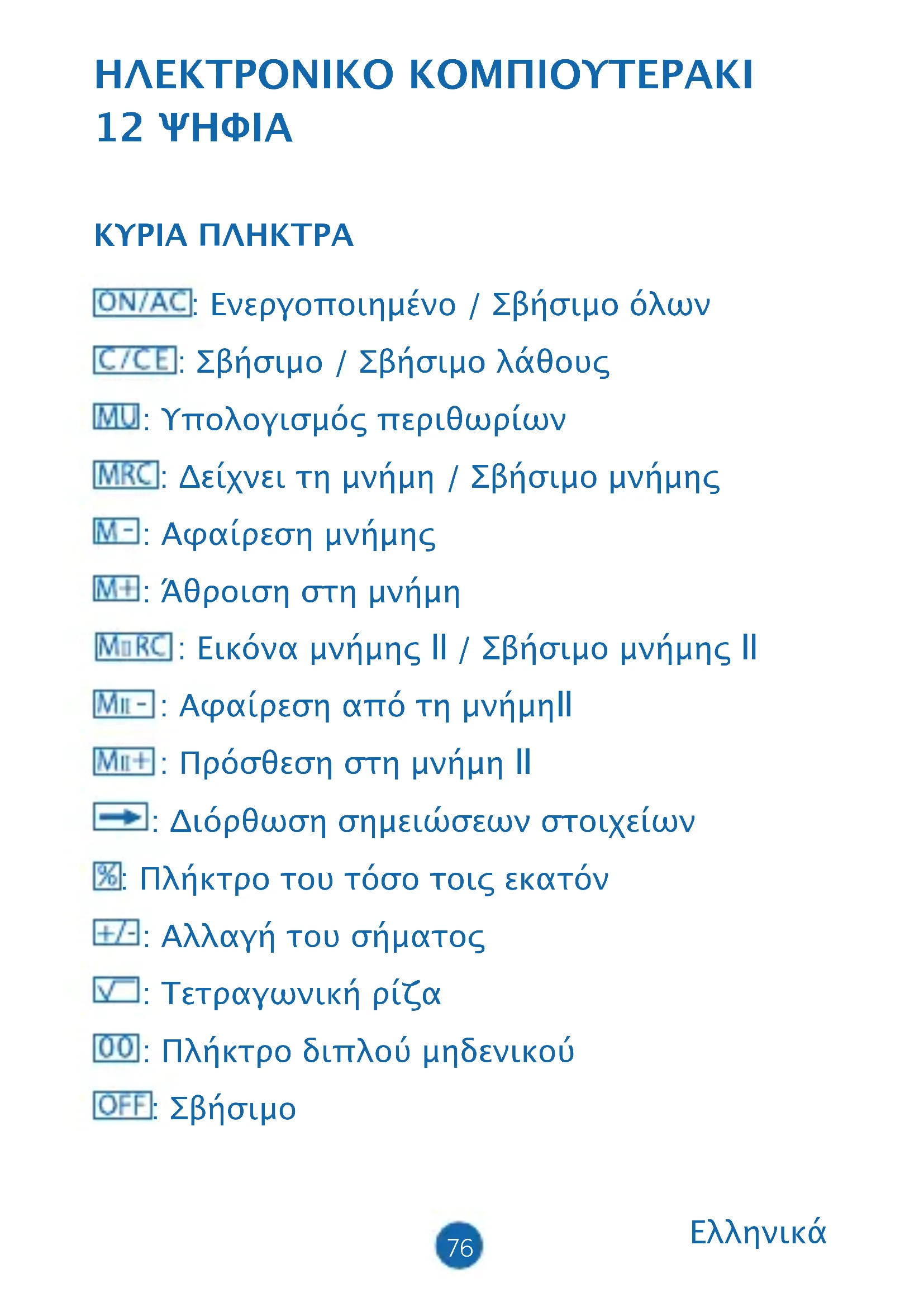 (5) Автоматическое отключение: Калькулятор отключается автоматически приблизительно через 8 минут бездействия.76 ΗΛΕΚΤΡΟΝΙΚΟ ΚΟΜΠΙΟΥΤΕΡΑΚΙ 12 ΨΗΦΙΑ ΚΥΡΙΑ ΠΛΗΚΤΡΑ : Ενεργοποιημένο / Σβήσιμο όλων : Σβήσιμο / Σβήσιμο λάθους : Υπολογισμός περιθωρίων : Δείχνει τη μνήμη / Σβήσιμο μνήμης : Αφαίρεση μνήμης : Άθροιση στη μνήμη : Εικόνα μνήμης II / Σβήσιμο μνήμης II : Αφαίρεση από τη μνήμηII : Πρόσθεση στη μνήμη II : Διόρθωση σημειώσεων στοιχείων : Πλήκτρο του τόσο τοις εκατόν : Αλλαγή του σήματος : Τετραγωνική ρίζα : Πλήκτρο διπλού μηδενικού