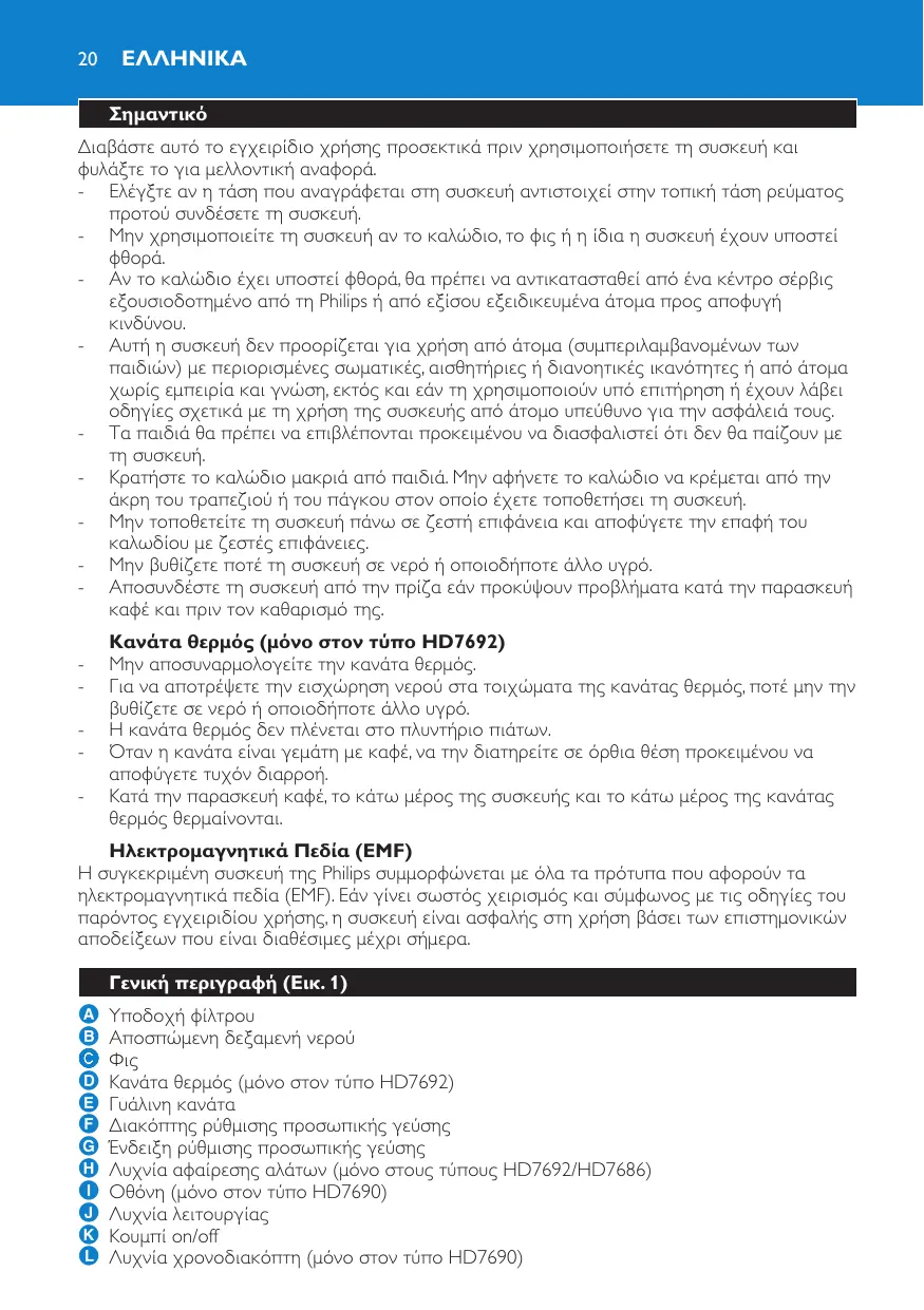 Κανάτα θερμός (μόνο στον τύπο HD7692) Μην αποσυναρμολογείτε την κανάτα θερμός. Για να αποτρέψετε την εισχώρηση νερού στα τοιχώματα της κανάτας θερμός, ποτέ μην την βυθίζετε σε νερό ή οποιοδήποτε άλλο υγρό. Η κανάτα θερμός δεν πλένεται στο πλυντήριο πιάτων. Όταν η κανάτα είναι γεμάτη με καφέ, να την διατηρείτε σε όρθια θέση προκειμένου να αποφύγετε τυχόν διαρροή. Κατά την παρασκευή καφέ, το κάτω μέρος της συσκευής και το κάτω μέρος της κανάτας θερμός θερμαίνονται. Ηλεκτρομαγνητικά Πεδία (EMF) Η συγκεκριμένη συσκευή της Philips συμμορφώνεται με όλα τα πρότυπα που αφορούν τα ηλεκτρομαγνητικά πεδία (EMF). Εάν γίνει σωστός χειρισμός και σύμφωνος με τις οδηγίες του παρόντος εγχειριδίου χρήσης, η συσκευή είναι ασφαλής στη χρήση βάσει των επιστημονικών αποδείξεων που είναι διαθέσιμες μέχρι σήμερα. Γενική περιγραφή (Εικ. 1)