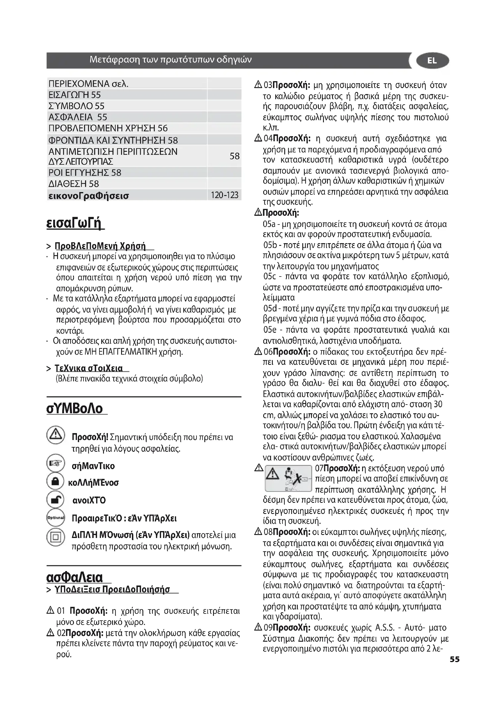 ΠΕΡΙΕΧΟΜΕΝΑ σελ. ΕΙΣΑΓΩΓΉ 55 ΣΎΜΒΟΛΟ 55 ΑΣΦΆΛΕΙΑ 55 ΠΡΟΒΛΕΠΌΜΕΝΗ ΧΡΉΣΗ 56 ΦΡΟΝΤΙΔΑ ΚΑΙ ΣΥΝΤΗΡΗΣΗ 58 ΑΝΤΙΜΕΤΩΠΙΣΗ ΠΕΡΙΠΤΩΣΕΩΝ ΔΥΣ ΛΕΙΤΟΥΡΓΙΑΣ