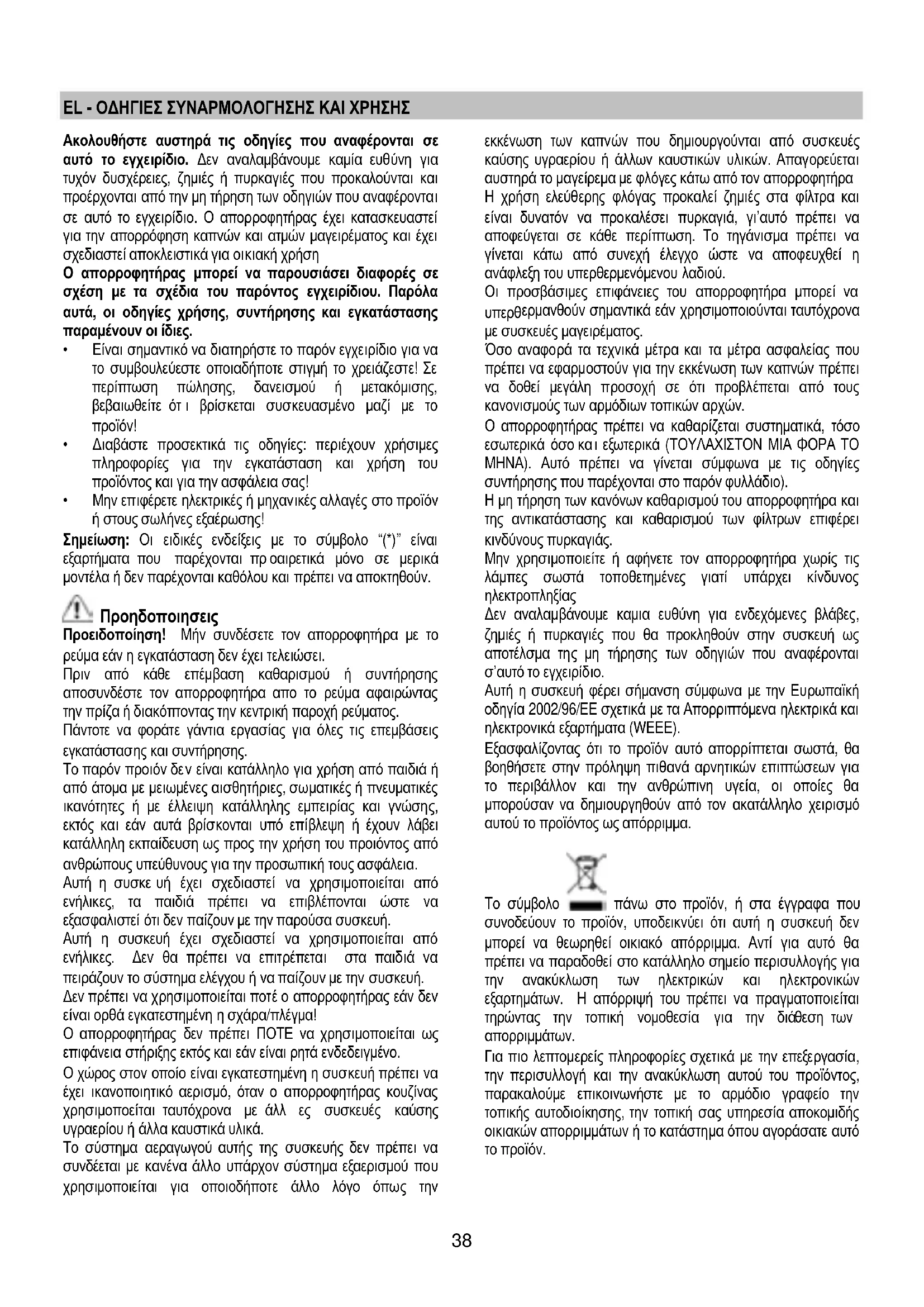Se a iluminação não funcionar, verifique se as lâmpadas foram instaladas corretamente no seu devido lugar antes de chamar a assistência técnica.38 EL - ΟΔΗΓΙΕΣ ΣΥΝΑΡΜΟΛΟΓΗΣΗΣ ΚΑΙ ΧΡΗΣΗΣ Ακολουθήστε αυστηρά τις οδηγίες που αναφέρονται σε αυτό το εγχειρίδιο. Δεν αναλαμβάνουμε καμία ευθύνη για τυχόν δυσχέρειες, ζημιές ή πυρκαγιές που προκαλούνται και προέρχονται από την μη τήρηση των οδηγιών που αναφέρονται σε αυτό το εγχειρίδιο. Ο απορροφητήρας έχει κατασκευαστεί για την απορρόφηση καπνών και ατμών μαγειρέματος και έχει