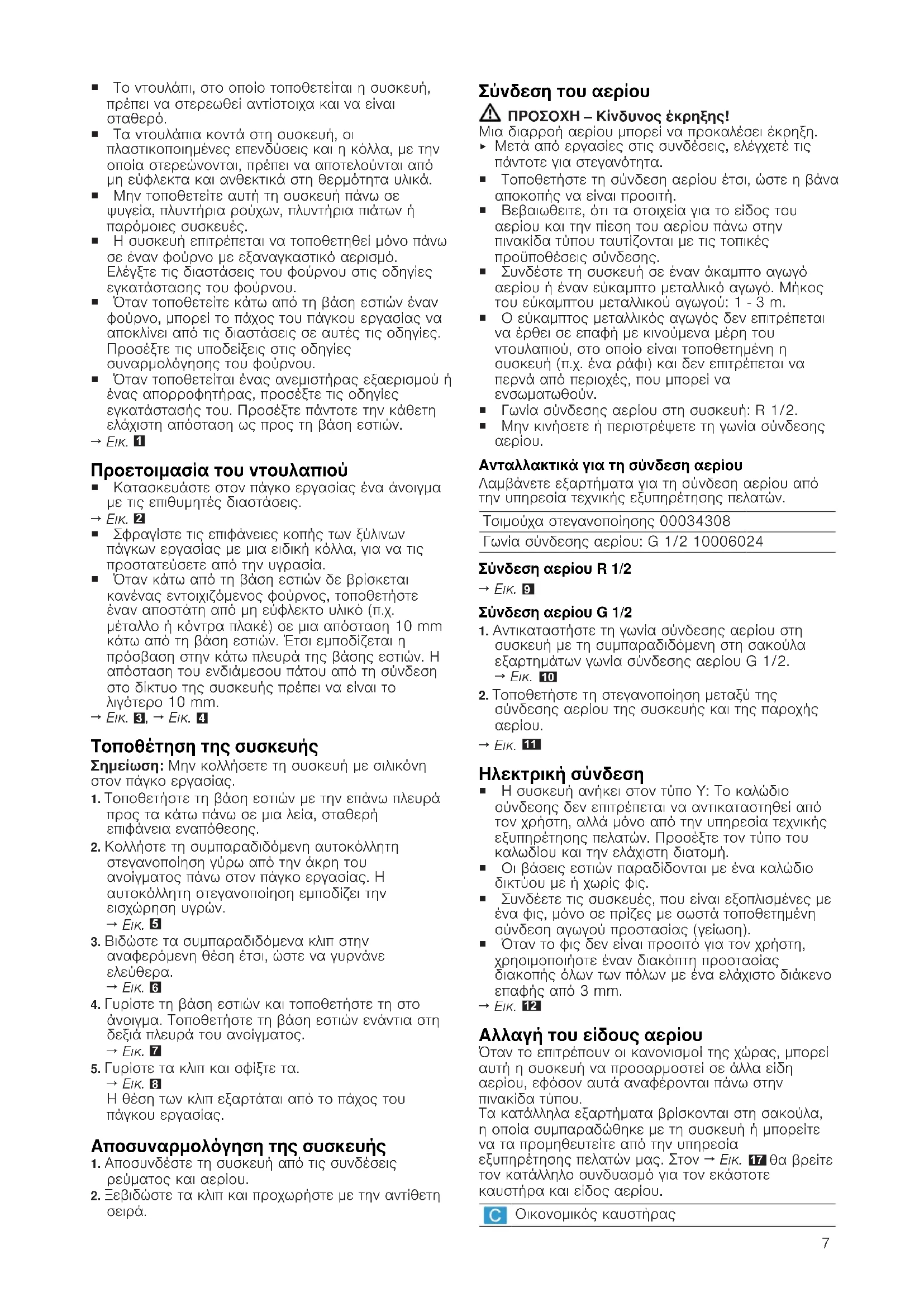 ¡ Γειώστε τις συσκευές με τροφοδοσία ρεύματος. ¡ Μην πραγματοποιήσετε αλλαγές στο εσωτερικό της συσκευής. Απευθυνθείτε, σε περίπτωση που χρειάζεται, στην υπηρεσία τεχνικής εξυπηρέτησης των πελατών μας. Πριν την τοποθέτηση ¡ Αυτή η συσκευή αντιστοιχεί στην κατηγορία 3 σύμφωνα με EN 30-1-1 για συσκευές αερίου: Εντοιχιζόμενη συσκευή.7 ¡ Το ντουλάπι, στο οποίο τοποθετείται η συσκευή, πρέπει να στερεωθεί αντίστοιχα και να είναι