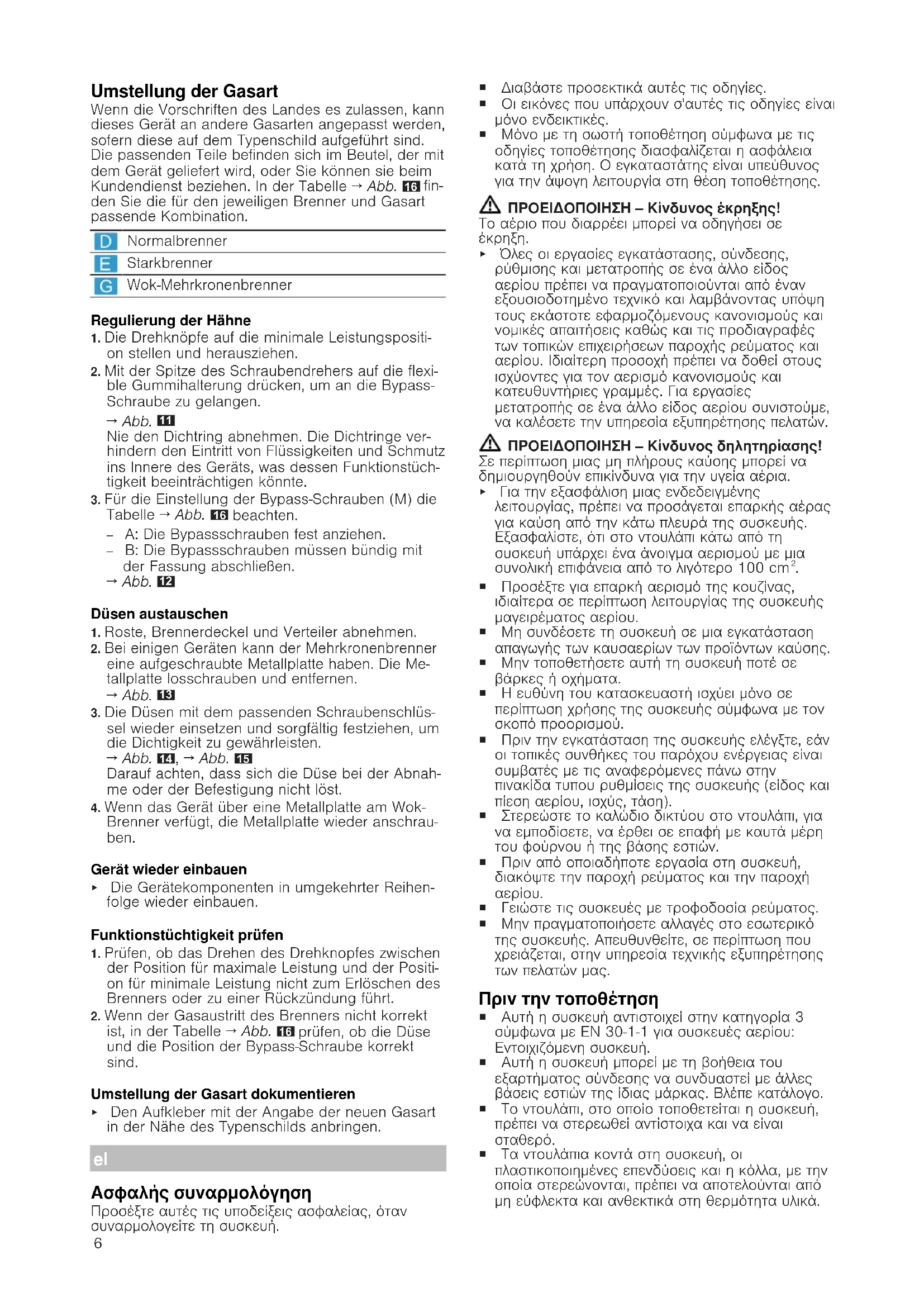 Ασφαλής συναρμολόγηση Προσέξτε αυτές τις υποδείξεις ασφαλείας, όταν συναρμολογείτε τη συσκευή. ¡ Διαβάστε προσεκτικά αυτές τις οδηγίες. ¡ Οι εικόνες που υπάρχουν σ'αυτές τις οδηγίες είναι μόνο ενδεικτικές. ¡ Μόνο με τη σωστή τοποθέτηση σύμφωνα με τις οδηγίες τοποθέτησης διασφαλίζεται η ασφάλεια κατά τη χρήση. Ο εγκαταστάτης είναι υπεύθυνος για την άψογη λειτουργία στη θέση τοποθέτησης. ΠΡΟΕΙΔΟΠΟΙΗΣΗ‒Κίνδυνος έκρηξης! Το αέριο που διαρρέει μπορεί να οδηγήσει σε