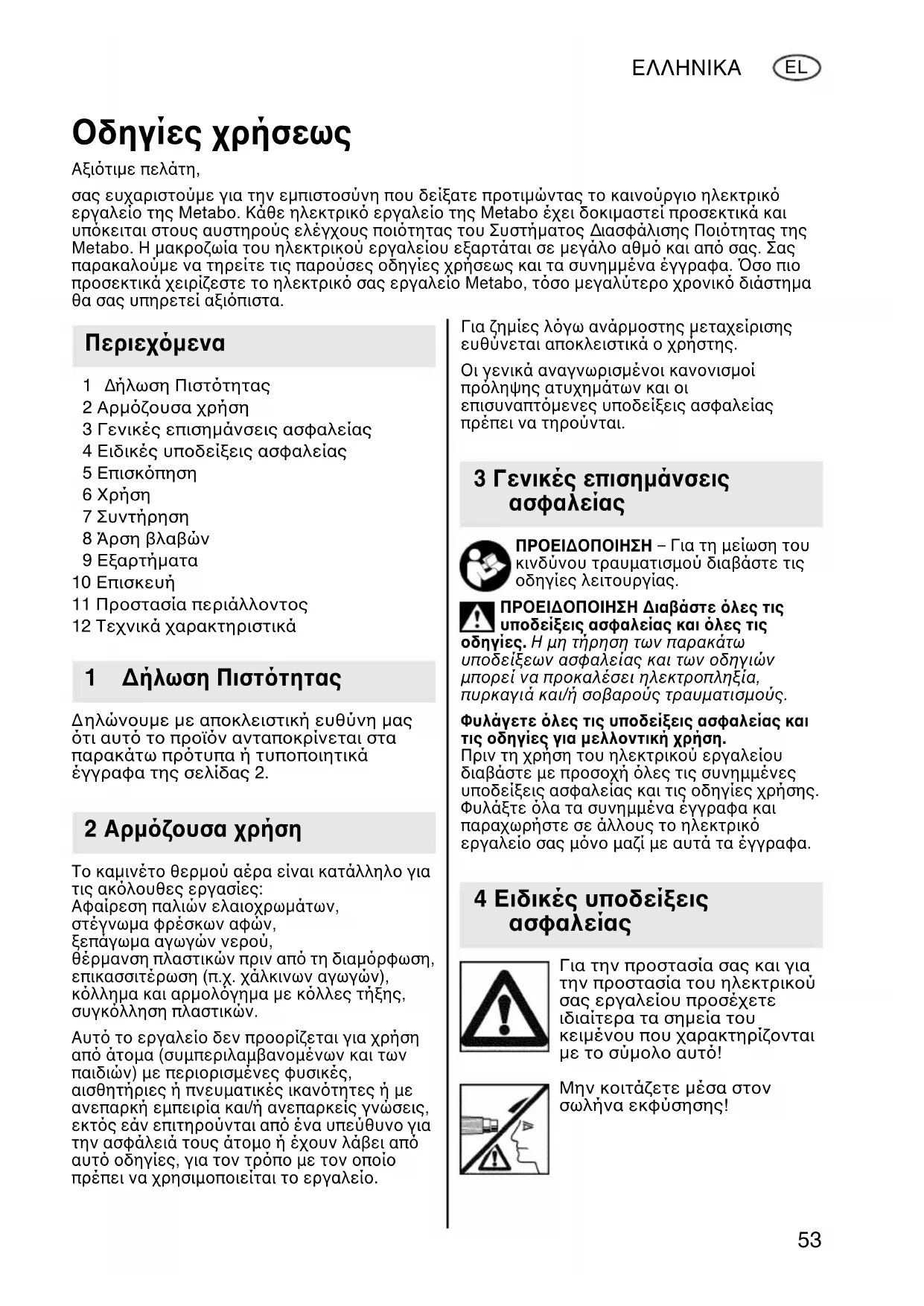 ήλωση Πισττητας 2 Αρζουσα χρήση 3 Γενικές επισηάνσεις ασφαλείας 4 Ειδικές υποδείξεις ασφαλείας 5 Επισκπηση 6 Χρήση 7 Συντήρηση 8 Άρση βλαβών 9 Εξαρτήατα 10 Επισκευή 11 Προστασία περιάλλοντος 12 Τεχνικά χαρακτηριστικά