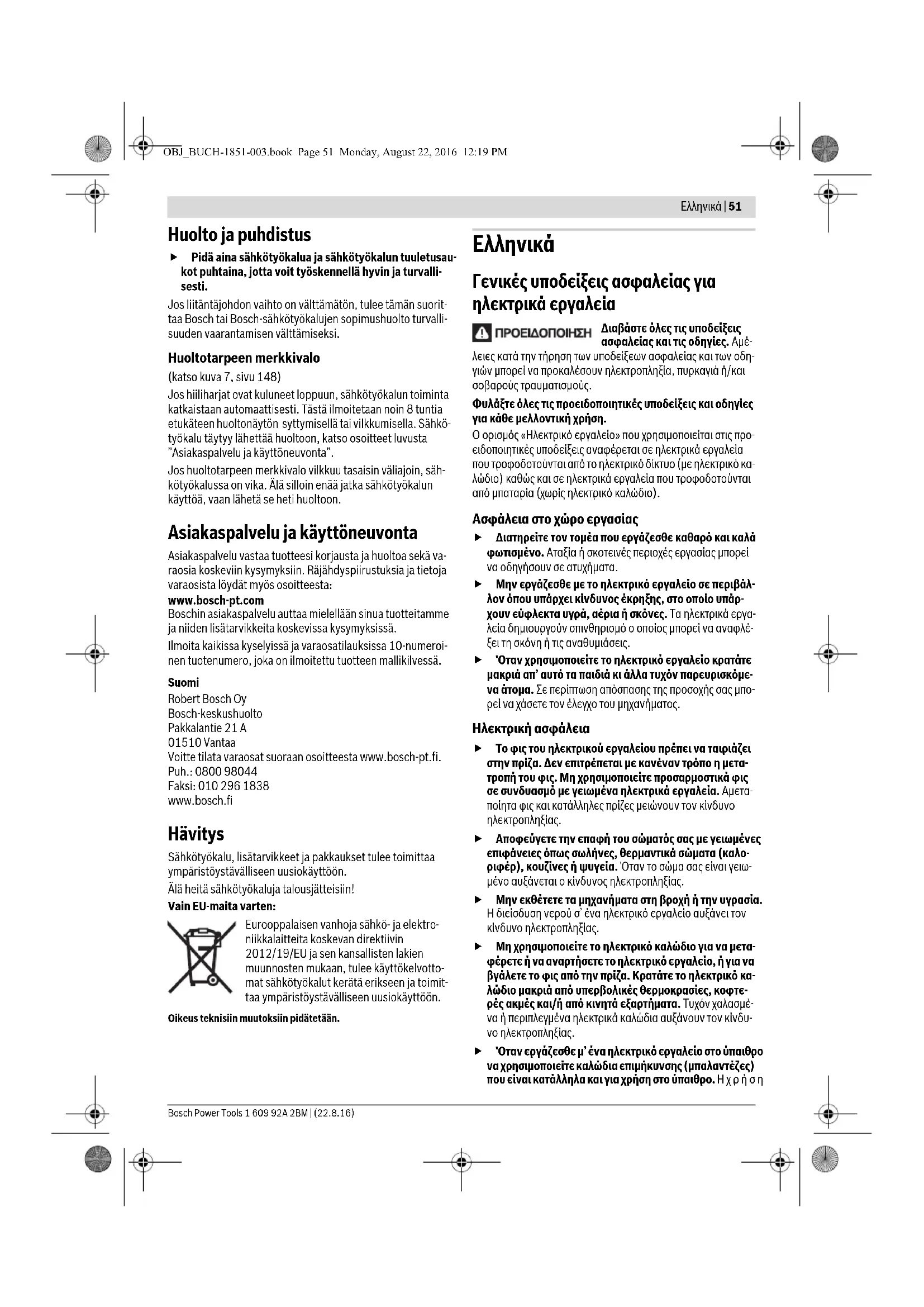 Γενικές υποδείξεις ασφαλείας για ηλεκτρικά εργαλεία Διαβάστε όλες τις υποδείξεις ασφαλείας και τις οδηγίες. Αμέ- λειες κατά την τήρηση των υποδείξεων ασφαλείας και των οδη- γιών μπορεί να προκαλέσουν ηλεκτροπληξία, πυρκαγιά ή/και σοβαρούς τραυματισμούς. Φυλάξτε όλες τις προειδοποιητικές υποδείξεις και οδηγίες για κάθε μελλοντική χρήση. Ο ορισμός «Ηλεκτρικό εργαλείο» που χρησιμοποιείται στις προ- ειδοποιητικές υποδείξεις αναφέρεται σε ηλεκτρικά εργαλεία που τροφοδοτούνται από το ηλεκτρικό δίκτυο (με ηλεκτρικό κα- λώδιο) καθώς και σε ηλεκτρικά εργαλεία που τροφοδοτούνται από μπαταρία (χωρίς ηλεκτρικό καλώδιο). Ασφάλεια στο χώρο εργασίας Διατηρείτε τον τομέα που εργάζεσθε καθαρό και καλά φωτισμένο. Αταξία ή σκοτεινές περιοχές εργασίας μπορεί να οδηγήσουν σε ατυχήματα. Μην εργάζεσθε με το ηλεκτρικό εργαλείο σε περιβάλ- λον όπου υπάρχει κίνδυνος έκρηξης, στο οποίο υπάρ- χουν εύφλεκτα υγρά, αέρια ή σκόνες. Τα ηλεκτρικά εργα- λεία δημιουργούν σπινθηρισμό ο οποίος μπορεί να αναφλέ- ξει τη σκόνη ή τις αναθυμιάσεις. Όταν χρησιμοποιείτε το ηλεκτρικό εργαλείο κρατάτε μακριά απ’ αυτό τα παιδιά κι άλλα τυχόν παρευρισκόμε- να άτομα. Σε περίπτωση απόσπασης της προσοχής σας μπο- ρεί να χάσετε τον έλεγχο του μηχανήματος. Ηλεκτρική ασφάλεια Το φις του ηλεκτρικού εργαλείου πρέπει να ταιριάζει στην πρίζα. Δεν επιτρέπεται με κανέναν τρόπο η μετα- τροπή του φις. Μη χρησιμοποιείτε προσαρμοστικά φις σε συνδυασμό με γειωμένα ηλεκτρικά εργαλεία. Αμετα- ποίητα φις και κατάλληλες πρίζες μειώνουν τον κίνδυνο ηλεκτροπληξίας. Αποφεύγετε την επαφή του σώματός σας με γειωμένες επιφάνειες όπως σωλήνες, θερμαντικά σώματα (καλο- ριφέρ), κουζίνες ή ψυγεία. Όταν το σώμα σας είναι γειω- μένο αυξάνεται ο κίνδυνος ηλεκτροπληξίας. Μην εκθέτετε τα μηχανήματα στη βροχή ή την υγρασία. Η διείσδυση νερού σ’ ένα ηλεκτρικό εργαλείο αυξάνει τον κίνδυνο ηλεκτροπληξίας. Μη χρησιμοποιείτε το ηλεκτρικό καλώδιο για να μετα- φέρετε ή να αναρτήσετε το ηλεκτρικό εργαλείο, ή για να βγάλετε το φις από την πρίζα. Κρατάτε το ηλεκτρικό κα- λώδιο μακριά από υπερβολικές θερμοκρασίες, κοφτε- ρές ακμές και/ή από κινητά εξαρτήματα. Τυχόν χαλασμέ- να ή περιπλεγμένα ηλεκτρικά καλώδια αυξάνουν τον κίνδυ- νο ηλεκτροπληξίας. Όταν εργάζεσθε μ’ ένα ηλεκτρικό εργαλείο στο ύπαιθρο να χρησιμοποιείτε καλώδια επιμήκυνσης (μπαλαντέζες) που είναι κατάλληλα και για χρήση στο ύπαιθρο. Ηχρήση OBJ_BUCH-1851-003.book Page 51 Monday, August 22, 2016 12:19 PM52 | Eλληνικά 1 609 92A 2BM | (22.8.16) Bosch Power Tools καλωδίων επιμήκυνσης κατάλληλων για υπαίθριους χώρους ελαττώνει τον κίνδυνο ηλεκτροπληξίας. Όταν η χρήση του ηλεκτρικού εργαλείου σε υγρό περι- βάλλον είναι αναπόφευκτη, τότε χρησιμοποιήστε έναν προστατευτικό διακόπτη διαρροής (διακόπτη FI/RCD). Η χρήση ενός προστατευτικού διακόπτη διαρροής ελαττώνει τον κίνδυνο ηλεκτροπληξίας. Ασφάλεια προσώπων Να είστε πάντοτε προσεκτικός/προσεκτική, να δίνετε προσοχή στην εργασία που κάνετε και να χειρίζεστε το μηχάνημα με περίσκεψη. Μη χρησιμοποιήσετε ένα ηλε- κτρικό εργαλείο όταν είστε κουρασμένος/κουρασμένη ή όταν βρίσκεστε υπό την επήρεια ναρκωτικών, οινοπνεύ- ματος ή φαρμάκων. Μια στιγμιαία απροσεξία κατά το χειρι- σμό του ηλεκτρικού εργαλείου μπορεί να οδηγήσει σε σοβα- ρούς τραυματισμούς. Φοράτε έναν κατάλληλο για σας προστατευτικό εξοπλι- σμό και πάντοτε προστατευτικά γυαλιά. Όταν φοράτε έναν κατ
