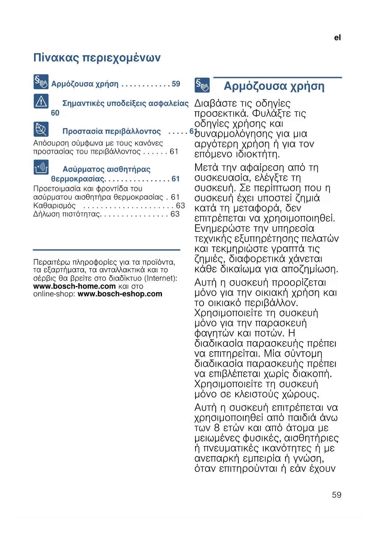 - Δήλωση πιστότητας Produktinfo Περαιτέρω πληροφορίες για τα προϊόντα, τα εξαρτήματα, τα ανταλλακτικά και το σέρβις θα βρείτε στο διαδίκτυο (Internet): www.bosch-home.com και στο online-shop: www.bosch-eshop.com 8 Αρμόζουσα χρήση Αρμόζουσα χρήση Διαβάστε τις οδηγίες προσεκτικά. Φυλάξτε τις οδηγίες χρήσης και συναρμολόγησης για μια αργότερη χρήση ή για τον επόμενο ιδιοκτήτη. Μετά την αφαίρεση από τη συσκευασία, ελέγξτε τη συσκευή. Σε περίπτωση που η συσκευή έχει υποστεί ζημιά κατά τη μεταφορά, δεν επιτρέπεται να χρησιμοποιηθεί. Ενημερώστε την υπηρεσία τεχνικής εξυπηρέτησης πελατών και τεκμηριώστε γραπτά τις ζημιές, διαφορετικά χάνεται κάθε δικαίωμα για αποζημίωση. Αυτή η συσκευή προορίζεται μόνο για την οικιακή χρήση και το οικιακό περιβάλλον. Χρησιμοποιείτε τη συσκευή μόνο για την παρασκευή φαγητών και ποτών. Η διαδικασία παρασκευής πρέπει να επιτηρείται. Μία σύντομη διαδικασία παρασκευής πρέπει να επιβλέπεται χωρίς διακοπή. Χρησιμοποιείτε τη συσκευή μόνο σε κλειστούς χώρους. Αυτή η συσκευή επιτρέπεται να χρησιμοποιηθεί από παιδιά άνω των 8 ετών και από άτομα με μειωμένες φυσικές, αισθητήριες ή πνευματικές ικανότητες ή με ανεπαρκή εμπειρία ή γνώση, όταν επιτηρούνται ή εάν έχουνel p. 63