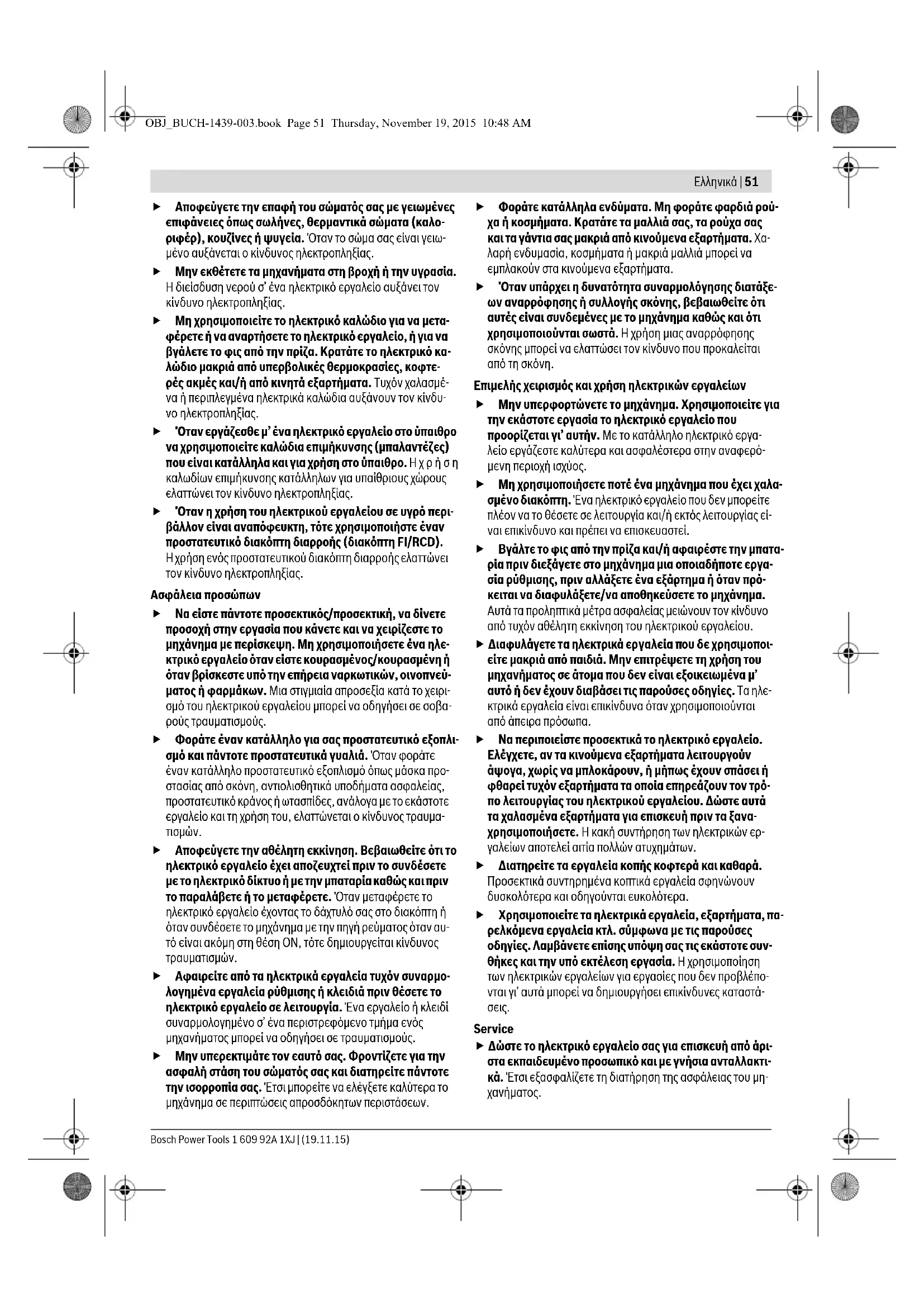 Διαβάστε όλες τις υποδείξεις ασφαλείας και τις οδηγίες. Αμέ- λειες κατά την τήρηση των υποδείξεων ασφαλείας και των οδη- γιών μπορεί να προκαλέσουν ηλεκτροπληξία, πυρκαγιά ή/και σοβαρούς τραυματισμούς. Φυλάξτε όλες τις προειδοποιητικές υποδείξεις και οδηγίες για κάθε μελλοντική χρήση. Ο ορισμός «Ηλεκτρικό εργαλείο» που χρησιμοποιείται στις προ- ειδοποιητικές υποδείξεις αναφέρεται σε ηλεκτρικά εργαλεία που τροφοδοτούνται από το ηλεκτρικό δίκτυο (με ηλεκτρικό κα- λώδιο) καθώς και σε ηλεκτρικά εργαλεία που τροφοδοτούνται από μπαταρία (χωρίς ηλεκτρικό καλώδιο). Ασφάλεια στο χώρο εργασίας Διατηρείτε τον τομέα που εργάζεσθε καθαρό και καλά φωτισμένο. Αταξία ή σκοτεινές περιοχές εργασίας μπορεί να οδηγήσουν σε ατυχήματα. Μην εργάζεσθε με το ηλεκτρικό εργαλείο σε περιβάλ- λον όπου υπάρχει κίνδυνος έκρηξης, στο οποίο υπάρ- χουν εύφλεκτα υγρά, αέρια ή σκόνες. Τα ηλεκτρικά εργα- λεία δημιουργούν σπινθηρισμό ο οποίος μπορεί να αναφλέ- ξει τη σκόνη ή τις αναθυμιάσεις. Όταν χρησιμοποιείτε το ηλεκτρικό εργαλείο κρατάτε μακριά απ’ αυτό τα παιδιά κι άλλα τυχόν παρευρισκόμε- να άτομα. Σε περίπτωση απόσπασης της προσοχής σας μπο- ρεί να χάσετε τον έλεγχο του μηχανήματος. Ηλεκτρική ασφάλεια Το φις του ηλεκτρικού εργαλείου πρέπει να ταιριάζει στην πρίζα. Δεν επιτρέπεται με κανέναν τρόπο η μετα- τροπή του φις. Μη χρησιμοποιείτε προσαρμοστικά φις σε συνδυασμό με γειωμένα ηλεκτρικά εργαλεία. Αμετα- ποίητα φις και κατάλληλες πρίζες μειώνουν τον κίνδυνο ηλεκτροπληξίας. OBJ_BUCH-1439-003.book Page 50 Thursday, November 19, 2015 10:48 AMΕλληνικά | 51 Bosch Power Tools 1 609 92A 1XJ | (19.11.15) Αποφεύγετε την επαφή του σώματός σας με γειωμένες επιφάνειες όπως σωλήνες, θερμαντικά σώματα (καλο- ριφέρ), κουζίνες ή ψυγεία. Όταν το σώμα σας είναι γειω- μένο αυξάνεται ο κίνδυνος ηλεκτροπληξίας. Μην εκθέτετε τα μηχανήματα στη βροχή ή την υγρασία. Η διείσδυση νερού σ’ ένα ηλεκτρικό εργαλείο αυξάνει τον κίνδυνο ηλεκτροπληξίας. Μη χρησιμοποιείτε το ηλεκτρικό καλώδιο για να μετα- φέρετε ή να αναρτήσετε το ηλεκτρικό εργαλείο, ή για να βγάλετε το φις από την πρίζα. Κρατάτε το ηλεκτρικό κα- λώδιο μακριά από υπερβολικές θερμοκρασίες, κοφτε- ρές ακμές και/ή από κινητά εξαρτήματα. Τυχόν χαλασμέ- να ή περιπλεγμένα ηλεκτρικά καλώδια αυξάνουν τον κίνδυ- νο ηλεκτροπληξίας. Όταν εργάζεσθε μ’ ένα ηλεκτρικό εργαλείο στο ύπαιθρο να χρησιμοποιείτε καλώδια επιμήκυνσης (μπαλαντέζες) που είναι κατάλληλα και για χρήση στο ύπαιθρο. Ηχρήση καλωδίων επιμήκυνσης κατάλληλων για υπαίθριους χώρους ελαττώνει τον κίνδυνο ηλεκτροπληξίας. Όταν η χρήση του ηλεκτρικού εργαλείου σε υγρό περι- βάλλον είναι αναπόφευκτη, τότε χρησιμοποιήστε έναν προστατευτικό διακόπτη διαρροής (διακόπτη FI/RCD). Η χρήση ενός προστατευτικού διακόπτη διαρροής ελαττώνει τον κίνδυνο ηλεκτροπληξίας. Ασφάλεια προσώπων Να είστε πάντοτε προσεκτικός/προσεκτική, να δίνετε προσοχή στην εργασία που κάνετε και να χειρίζεστε το μηχάνημα με περίσκεψη. Μη χρησιμοποιήσετε ένα ηλε- κτρικό εργαλείο όταν είστε κουρασμένος/κουρασμένη ή όταν βρίσκεστε υπό την επήρεια ναρκωτικών, οινοπνεύ- ματος ή φαρμάκων. Μια στιγμιαία απροσεξία κατά το χειρι- σμό του ηλεκτρικού εργαλείου μπορεί να οδηγήσει σε σοβα- ρούς τραυματισμούς. Φοράτε έναν κατάλληλο για σας προστατευτικό εξοπλι- σμό και πάντοτε προστατευτικά γυαλιά. Όταν φοράτε έναν κατάλληλο προστατευτικό εξοπλισμό όπως μάσκα προ- στ