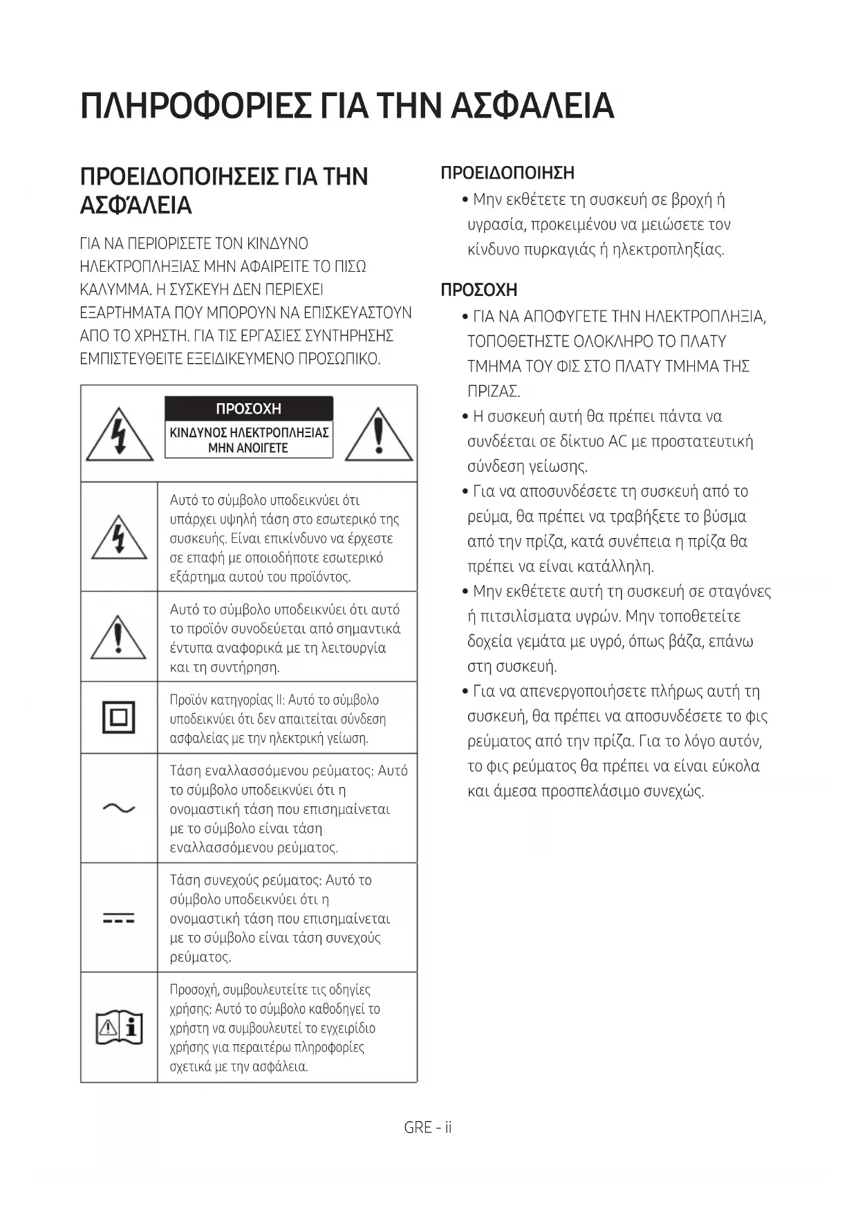 - Για να απενεργοποιήσετε πλήρως αυτή τη συσκευή, θα πρέπει να αποσυνδέσετε το φις ρεύματος από την πρίζα. Για το λόγο αυτόν, το φις ρεύματος θα πρέπει να είναι εύκολα και άμεσα προσπελάσιμο συνεχώς.GRE - iii ΠΡΟΦΥΛΑΞΕΊΣ