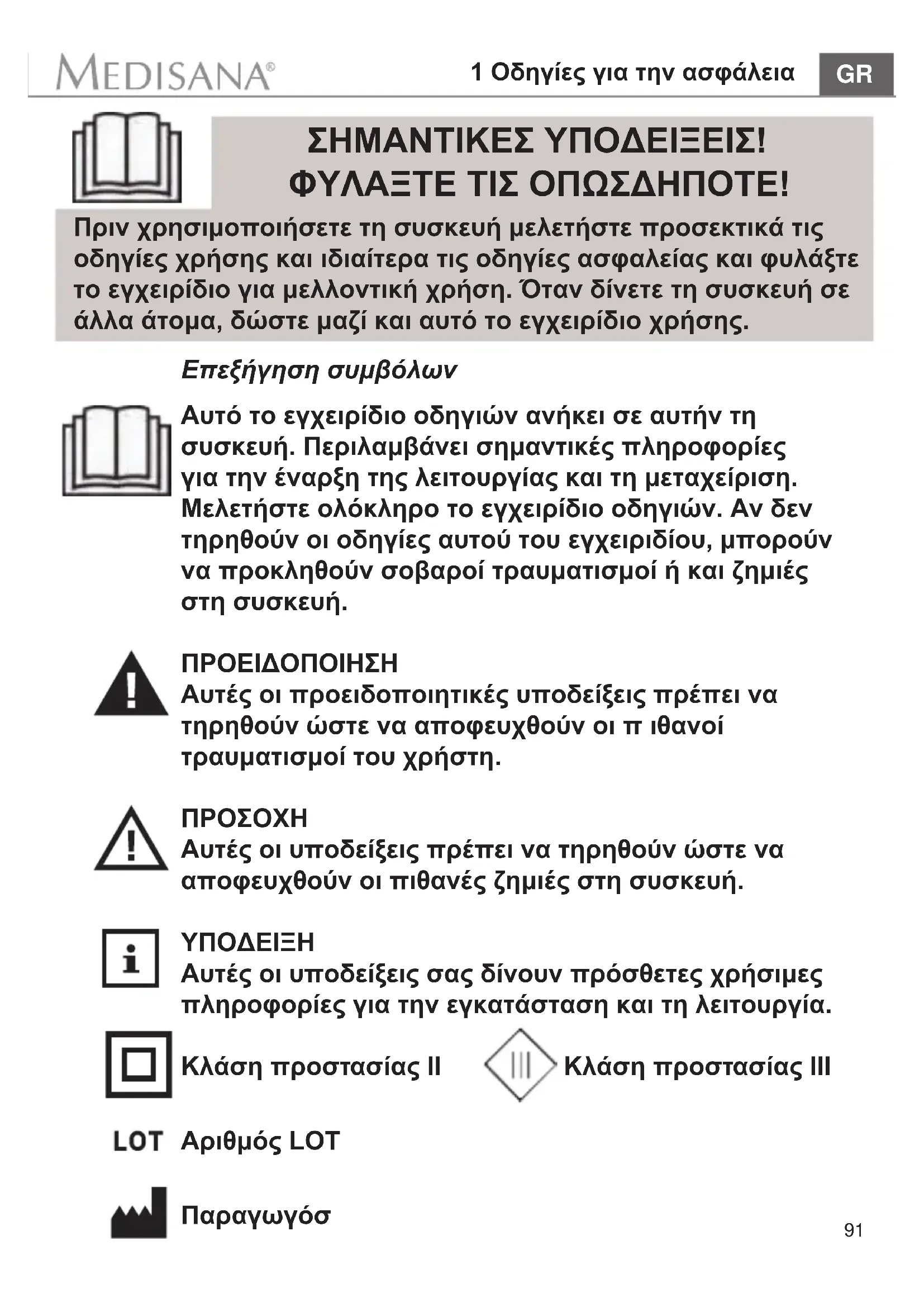 Πριν χρησιμοποιήσετε τη συσκευή μελετήστε προσεκτικά τις οδηγίες χρήσης και ιδιαίτερα τις οδηγίες ασφαλείας και φυλάξτε το εγχειρίδιο για μελλοντική χρήση. Όταν δίνετε τη συσκευή σε άλλα άτομα, δώστε μαζί και αυτό το εγχειρίδιο χρήσης. ΣΗΜΑΝΤΙΚΕΣ ΥΠΟΔΕΙΞΕΙΣ! ΦΥΛΑΞΤΕ ΤΙΣ ΟΠΩΣΔΗΠΟΤΕ!92 1 Οδηγίες για την ασφάλεια