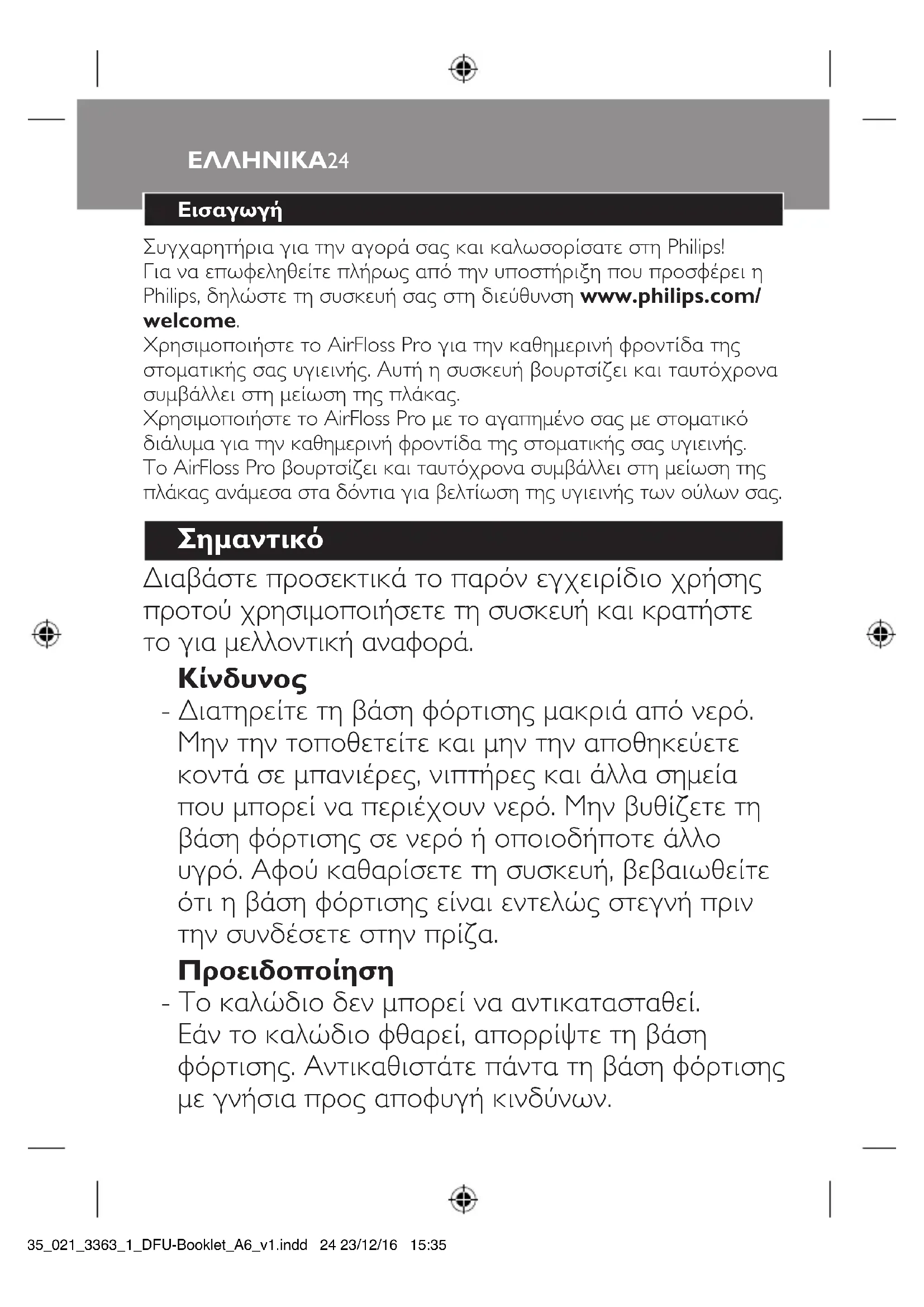 - Διατηρείτε τη βάση φόρτισης μακριά από νερό. Μην την τοποθετείτε και μην την αποθηκεύετε κοντά σε μπανιέρες, νιπτήρες και άλλα σημεία που μπορεί να περιέχουν νερό. Μην βυθίζετε τη βάση φόρτισης σε νερό ή οποιοδήποτε άλλο υγρό. Αφού καθαρίσετε τη συσκευή, βεβαιωθείτε ότι η βάση φόρτισης είναι εντελώς στεγνή πριν την συνδέσετε στην πρίζα. Προειδοποίηση - Το καλώδιο δεν μπορεί να αντικατασταθεί. Εάν το καλώδιο φθαρεί, απορρίψτε τη βάση φόρτισης. Αντικαθιστάτε πάντα τη βάση φόρτισης με γνήσια προς αποφυγή κινδύνων. ΕΛΛΗΝΙΚΑ24 4235_021_3363_1_DFU-Booklet_A6_v1.indd 24 23/12/16 15:3525 - Για την επαναφόρτιση της μπαταρίας να χρησιμοποιείτε μόνο τον τύπο βάσης φόρτισης HX6100 που παρέχεται με το AirFloss Pro. - Εάν η συσκευή υποστεί οποιαδήποτε βλάβη (στόμιο ψεκασμού, λαβή ή/και βάση φόρτισης AirFloss Pro), σταματήστε να την χρησιμοποιείτε. - Αυτή η συσκευή περιλαμβάνει μέρη που δεν επισκευάζονται. Εάν η συσκευή υποστεί βλάβη, επικοινωνήστε με το Κέντρο εξυπηρέτησης καταναλωτών στη χώρα σας (βλ. κεφάλαιο “Εγγύηση και υποστήριξη”). - Μην χρησιμοποιείτε τη βάση φόρτισης σε εξωτερικούς χώρους ή κοντά σε θερμαινόμενες επιφάνειες. - Αυτή η συσκευή μπορεί να χρησιμοποιηθεί από παιδιά ηλικίας 8 ετών και άνω, καθώς και από άτομα με περιορισμένες σωματικές, αισθητήριες ή διανοητικές ικανότητες ή χωρίς εμπειρία και γνώση, με την προϋπόθεση ότι τη χρησιμοποιούν υπό επίβλεψη ή έχουν λάβει οδηγίες σχετικά με την ασφαλή της χρήση και κατανοούν τους ενεχόμενους κινδύνους. Τα παιδιά δεν πρέπει να καθαρίζουν τη συσκευή ή να εκτελούν διεργασίες συντήρησης, εκτός κι αν είναι πάνω από 8 ετών και επιβλέπονται από κάποιον ενήλικα. Κρατήστε τη συσκευή και το καλώδιο μακριά από παιδιά κάτω των 8 ετών. - Τα παιδιά δεν πρέπει να παίζουν με τη συσκευή.
