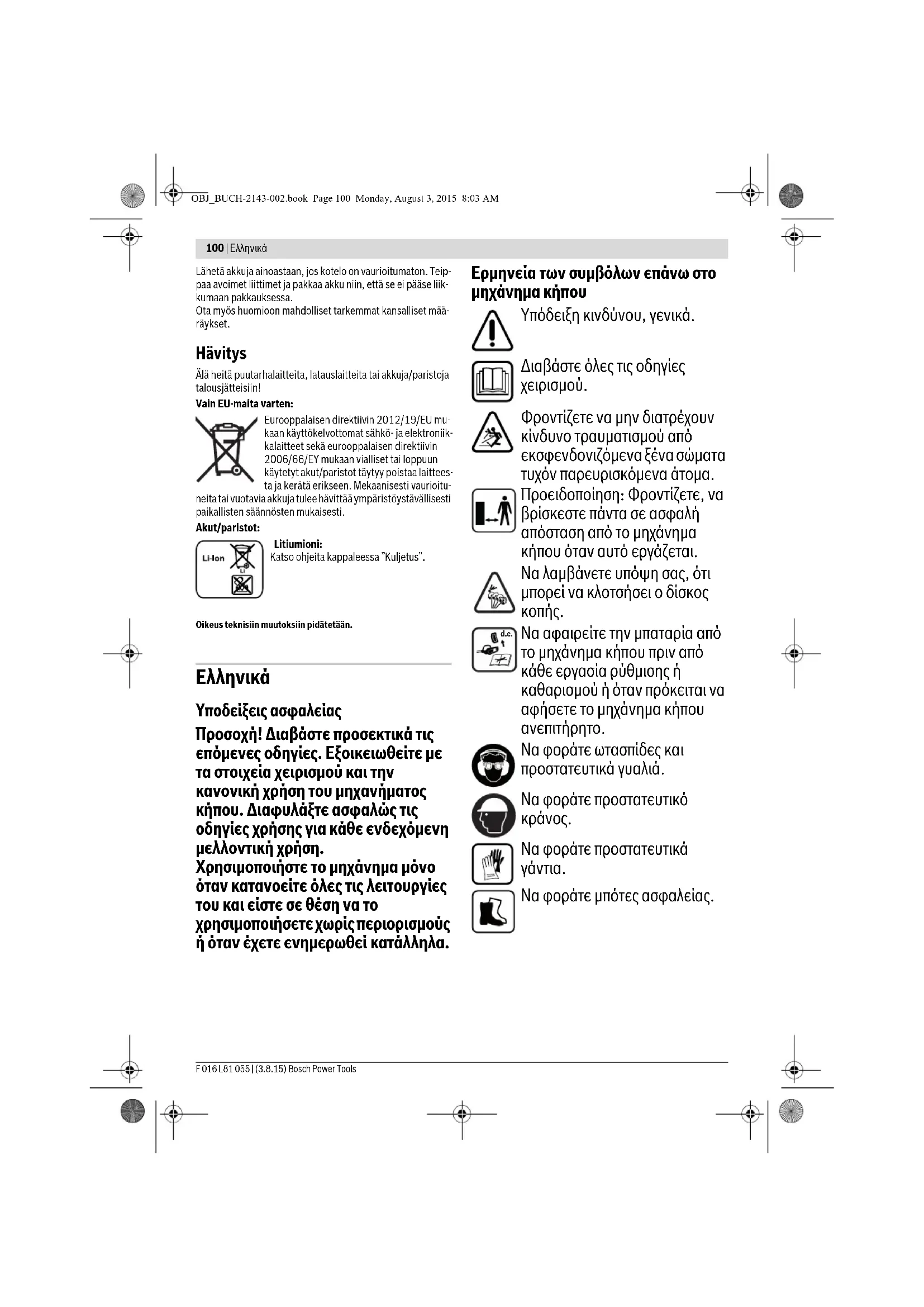 – Να δίνετε ιδιαίτερη προσοχή όταν αλλάζετε κατεύθυνση στις επικλινείς επιφάνειες. Μην πλησιάζετε το εργαλείο κοπής με τα χέρια και τα πόδια σας, ιδιαίτερα όταν το θέτετε σε λειτουργία. Περιμένετε να σταματήσουν εντελώς να κινούνται τα περιστρεφόμενα εξαρτήματα κοπής πριν τα αγγίξετε. Τα εξαρτήματα κοπής συνεχίζουν να κινούνται για λίγο μετά τη θέση εκτός λειτουργίας του μηχανήματος κήπου και μπορούν έτσι να προκαλέσουν τραυματισμούς. Να προστατεύετε τον εαυτό σας από το ενσωματωμένο μαχαίρι που κόβει τη μεσηνέζα στο κατάλληλο μήκος. Πριν και μετά την τοποθέτηση ή τη συμπλήρωση της μεσηνέζας να γυρίζετε το μηχάνημα κήπου στην οριζόντια θέση εργασίας πριν το θέσετε σε λειτουργία. Να θέτετε το μηχάνημα κήπου εκτός λειτουργίας πριν το μεταφέρετε στην ή από την επιφάνεια εργασίας. Θέστε το μηχάνημα κήπου εκτός λειτουργίας και αφαιρέστε την μπαταρία από την υποδοχή μπαταρίας: – πάντοτε όταν πρόκειται να αφήσετε το μηχάνημα κήπου ανεπιτήρητο, – όταν εξουδετερώνετε τυχόν μπλοκαρίσματα, – πριν αλλάξετε τη διάταξη κοπής, – όταν ελέγχετε ή καθαρίζετε το μηχάνημα κήπου ή διεξάγετε κάποια εργασία σ’ αυτό, – όταν το μηχάνημα κήπου προσκρούσει σε κάποιο ξένο αντικείμενο. Ελέγξτε αμέσως μήπως το μηχάνημα κήπου παρουσιάζει OBJ_BUCH-2143-002.book Page 102 Monday, August 3, 2015 8:03 AMEλληνικά | 103 Bosch Power Tools F 016 L81 055 | (3.8.15) ζημιές ή βλάβες και, αν χρειαστεί, δώστε το για επισκευή, – όταν Το μηχάνημα κήπου αρχίζει να δονείται ασυνήθιστα (ελέγξτε το