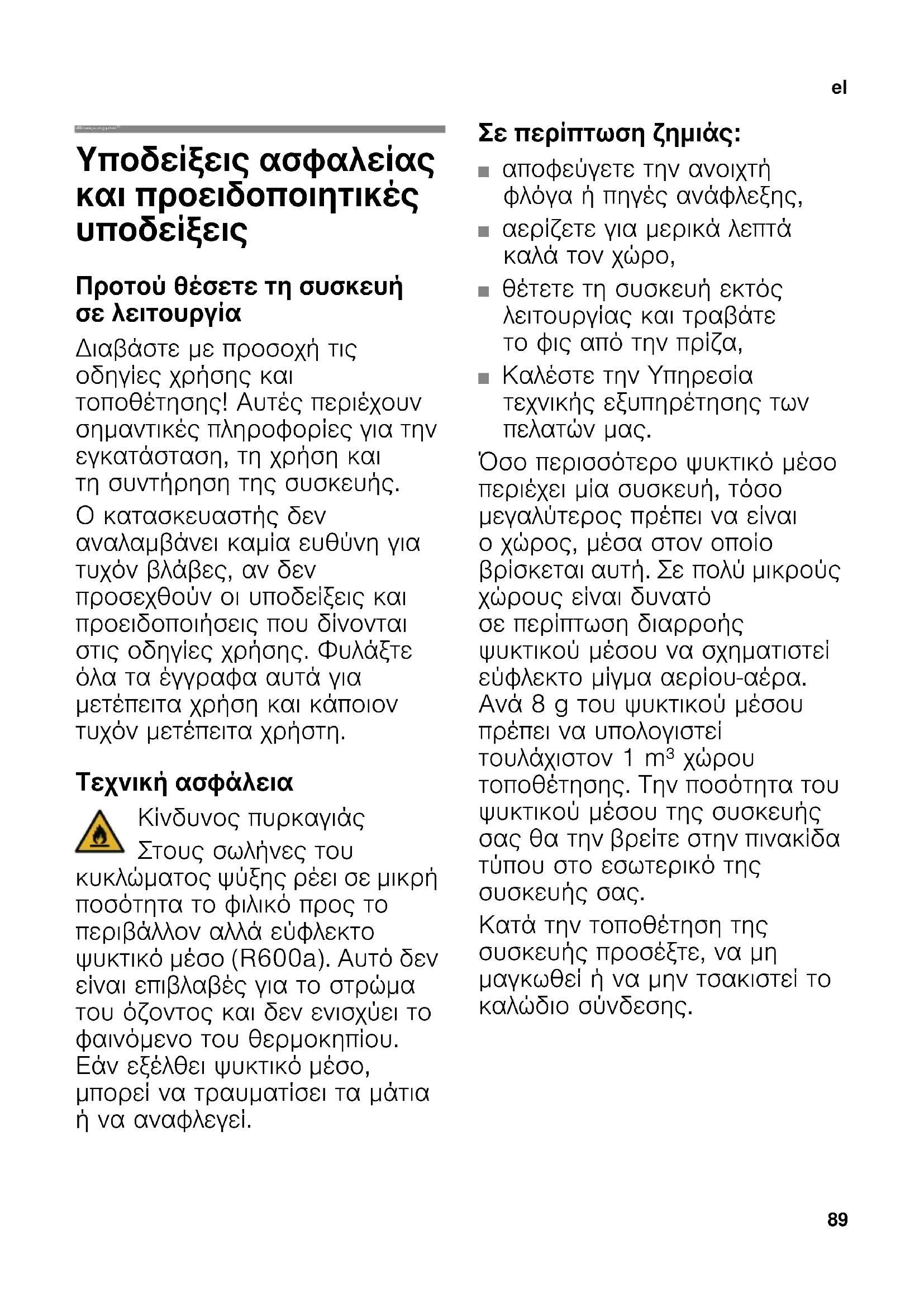 τα έγγραφα αυτά για μετέπειτα χρήση και κάποιον τυχόν μετέπειτα χρήστη. Τεχνική ασφάλεια Κίνδυνος πυρκαγιάς Στους σωλήνες του κυκλώματος ψύξης ρέει σε μικρή ποσότητα το φιλικό προς το περιβάλλον αλλά εύφλεκτο ψυκτικό μέσο (R600a). Αυτό δεν είναι επιβλαβές για το στρώμα του όζοντος και δεν ενισχύει το φαινόμενο του θερμοκηπίου. Εάν εξέλθει ψυκτικό
