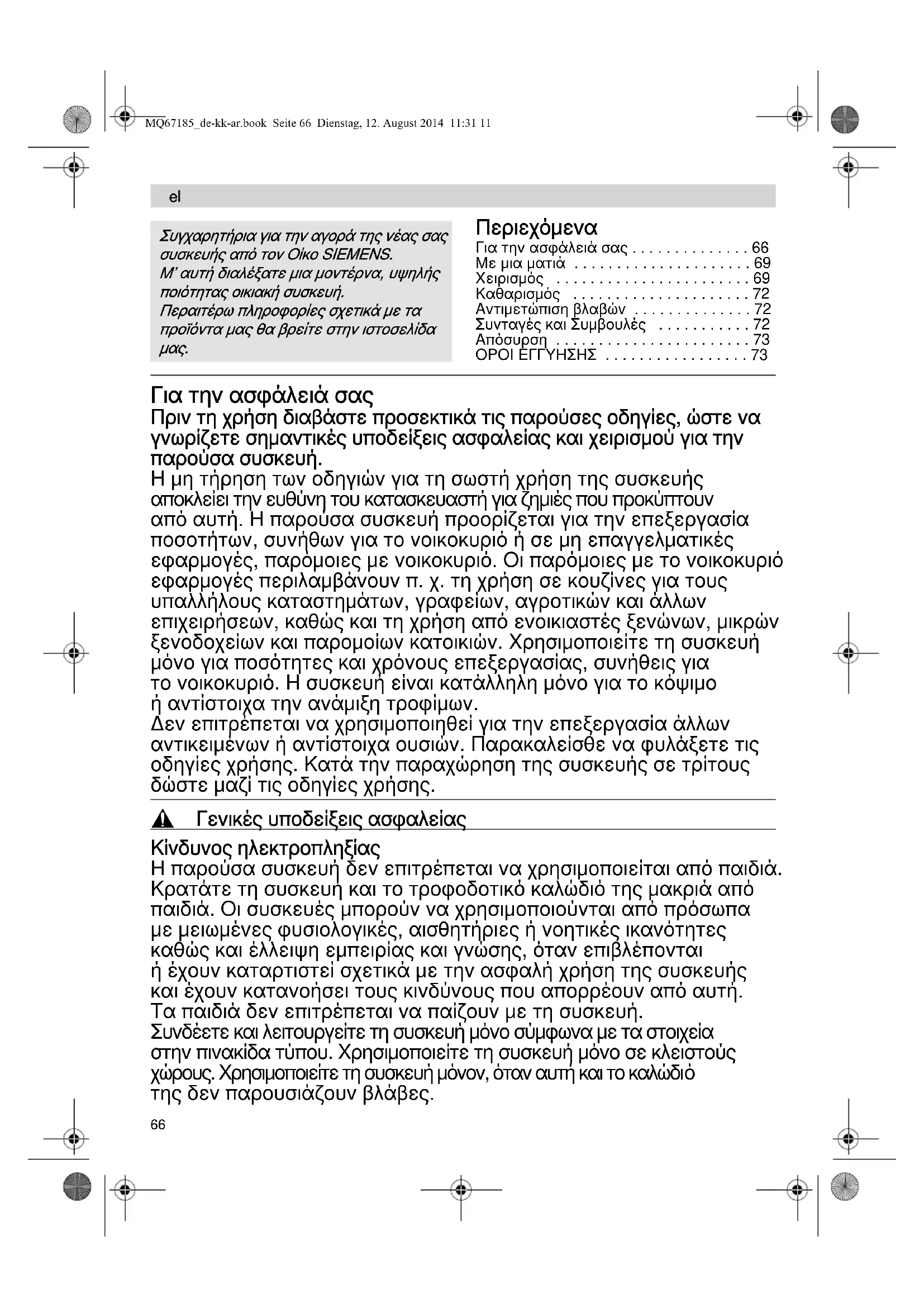 - Oikeudet muutoksiin pidätetään. MQ67185_de-kk-ar.book Seite 65 Dienstag, 12. August 2014 11:31 1166 Περιεχόμενα Για την ασφάλειά σας p. 66