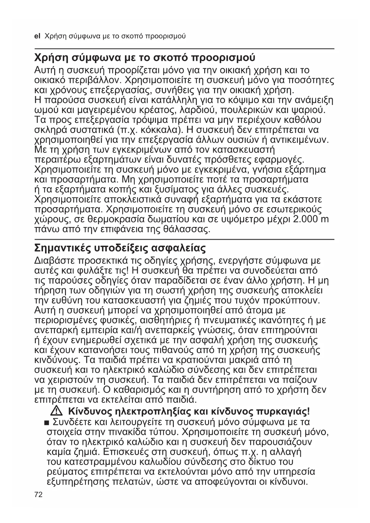 Hävitä pakkaus ympäristöystäväl- lisesti. Tämän laitteen merkintä perustuu käytettyjä sähkö- ja elektroniikkalaitteita (waste electrical and electronic equipment – WEEE) koskevaan direktiiviin 2012/19/EU. Tämä direktiivi määrittää käytettyjen laitteiden palautus- ja kierrätys-sään- nökset koko EU:n alueella. Tietoja oikeasta jätehuollosta saa myyjältä tai kunnalliselta jäteneuvojalta. Takuu Tälle laitteelle ovat voimassa maahantuojan myöntämät takuuehdot. Täydelliset takuue- hdot saat myyntiliikkeeltä, josta olet ostanut laitteen. Takuutapauksessa on näytettävä ostokuitti. Oikeus muutoksiin pidätetään.72 el Χρήση σύμφωνα με το σκοπό προορισμού Χρήση σύμφωνα με το σκοπό προορισμού Αυτή η συσκευή προορίζεται μόνο για την οικιακή χρήση και το οικιακό περιβάλλον. Χρησιμοποιείτε τη συσκευή μόνο για ποσότητες και χρόνους επεξεργασίας, συνήθεις για την οικιακή χρήση. Η παρούσα συσκευή είναι κατάλληλη για το κόψιμο και την ανάμειξη ωμού και μαγειρεμένου κρέατος, λαρδιού, πουλερικών και ψαριού. Τα προς επεξεργασία τρόψιμα πρέπει να μην περιέχουν καθόλου σκληρά συστατικά (π.χ. κόκκαλα). Η συσκευή δεν επιτρέπεται να χρησιμοποιηθεί για την επεξεργασία άλλων ουσιών ή αντικειμένων. Με τη χρήση των εγκεκριμένων από τον κατασκευαστή περαιτέρω εξαρτημάτων είναι δυνατές πρόσθετες εφαρμογές. Χρησιμοποιείτε τη συσκευή μόνο με εγκεκριμένα, γνήσια εξάρτημα και προσαρτήματα. Μη χρησιμοποιείτε ποτέ τα προσαρτήματα ή τα εξαρτήματα κοπής και ξυσίματος για άλλες συσκευές. Χρησιμοποιείτε αποκλειστικά συναφή εξαρτήματα για τα εκάστοτε προσαρτήματα. Χρησιμοποιείτε τη συσκευή μόνο σε εσωτερικούς χώρους, σε θερμοκρασία δωματίου και σε υψόμετρο μέχρι 2.000 m πάνω από την επιφάνεια της θάλασσας. Σημαντικές υποδείξεις ασφαλείας Διαβάστε προσεκτικά τις οδηγίες χρήσης, ενεργήστε σύμφωνα με αυτές και φυλάξτε τις! Η συσκευή θα πρέπει να συνοδεύεται από τις παρούσες οδηγίες όταν παραδίδεται σε έναν άλλο χρήστη. Η μη τήρηση των οδηγιών για τη σωστή χρήση της συσκευής αποκλείει την ευθύνη του κατασκευαστή για ζημιές που τυχόν προκύπτουν. Αυτή η συσκευή μπορεί να χρησιμοποιηθεί από άτομα με περιορισμένες φυσικές, αισθητήριες ή πνευματικές ικανότητες ή με ανεπαρκή εμπειρία και/ή ανεπαρκείς γνώσεις, όταν επιτηρούνται ή έχουν ενημερωθεί σχετικά με την ασφαλή χρήση της συσκευής και έχουν κατανοήσει τους πιθανούς από τη χρήση της συσκευής κινδύνους. Τα παιδιά πρέπει να κρατιούνται μακριά από τη συσκευή και το ηλεκτρικό καλώδιο σύνδεσης και δεν επιτρέπεται να χειριστούν τη συσκευή. Τα παιδιά δεν επιτρέπεται να παίζουν με τη συσκευή. Ο καθαρισμός και η συντήρηση από το χρήστη δεν επιτρέπεται να εκτελείται από παιδιά. W Κίνδυνος ηλεκτροπληξίας και κίνδυνος πυρκαγιάς! ■ Συνδέετε και λειτουργείτε τη συσκευή μόνο σύμφωνα με τα στοιχεία στην πινακίδα τύπου. Χρησιμοποιείτε τη συσκευή μόνο, όταν το ηλεκτρικό καλώδιο και η συσκευή δεν παρουσιάζουν καμία ζημιά. Επισκευές στη συσκευή, όπως π.χ. η αλλαγή του κατεστραμμένου καλωδίου σύνδεσης στο δίκτυο του ρεύματος επιτρέπεται να εκτελούνται μόνο από την υπηρεσία εξυπηρέτησης πελατών, ώστε να αποφεύγονται οι κίνδυνοι.73