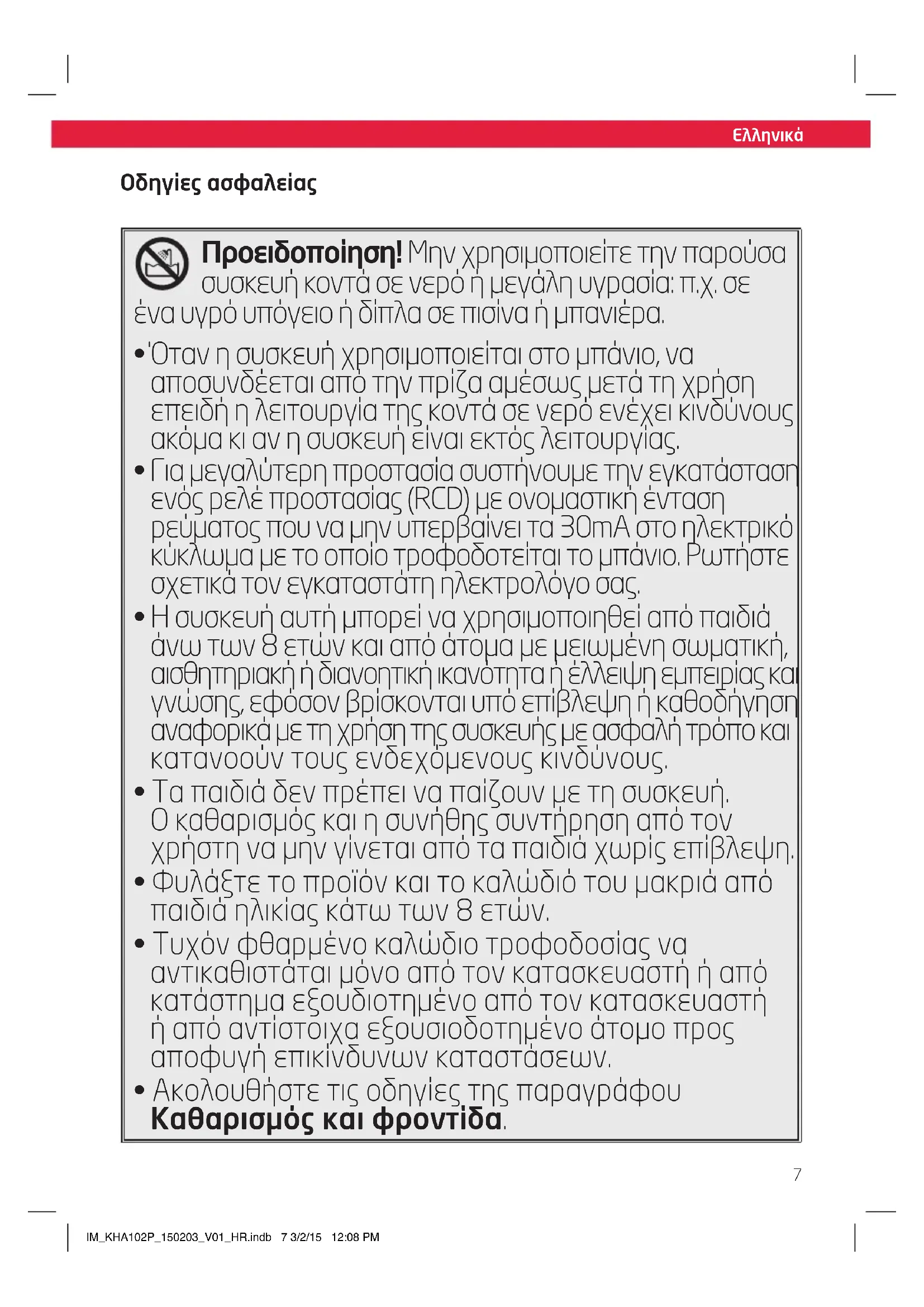 - Φιλάξτε Το προῖν και Το καλώδίο του μακρία ἀπό παιδία ἡλικίας κάτω των 8 ετών.