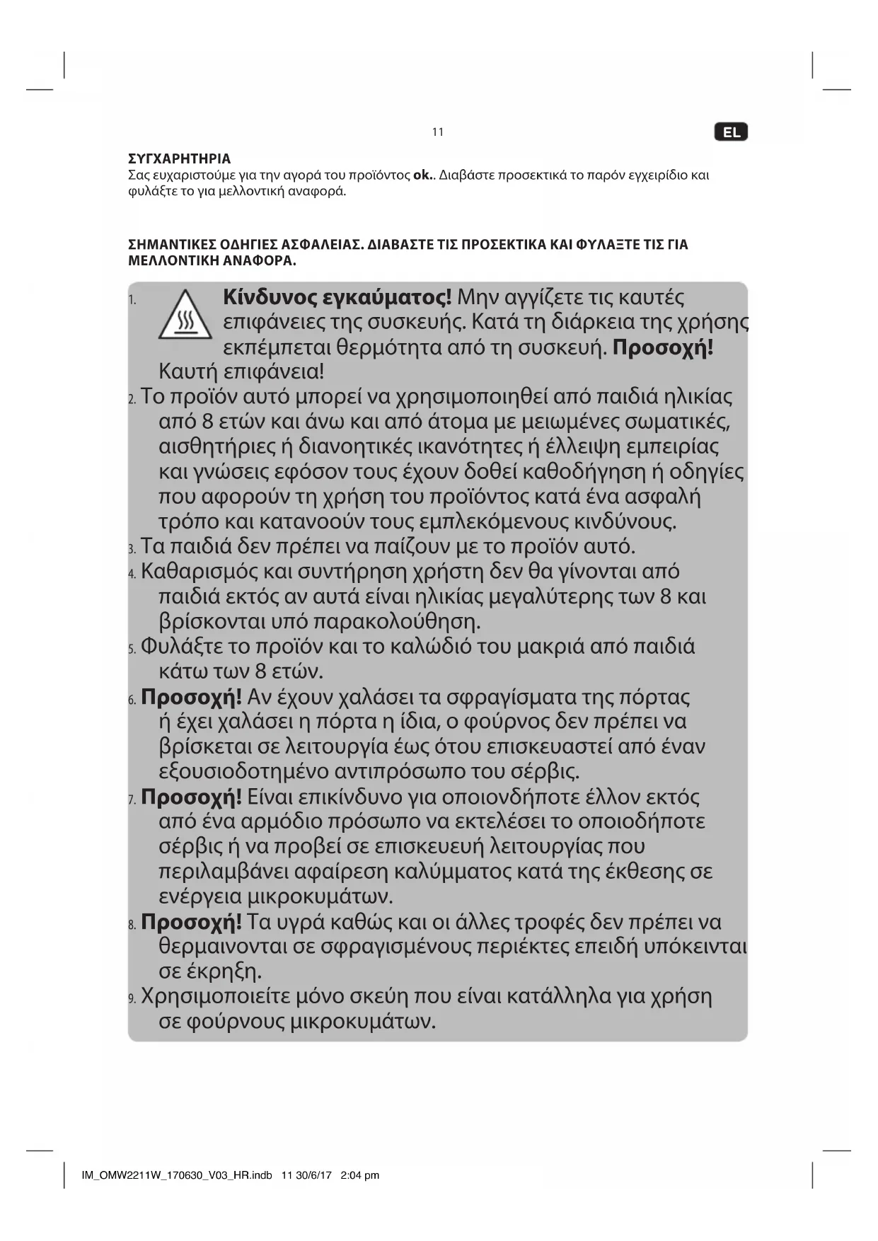 Οι οσμές στην κοιλότητα μπορούν να εξουδετερωθούν γεμίζοντας ένα κατάλληλο για τα μικροκύματα φλιτζάνι με νερό και χυμό λεμονιού αφήνοντας το να βράσει στο φούρνο μικροκυμάτων για 5 λεπτά. ΤΕΧνΙκΑ ΧΑΡΑκΤΗΡΙΣΤΙκΑ Ονομαστική τάση : 230-240 V~, 50 Hz Ονομαστική ισχύς εισόδου : 1200 W (Mikrowelle) 900 W (Grill) Ονομαστική έξοδος ισχύος : 700 W Συχνότητα λειτουργίας : 2450 MHz Εξωτερικές διαστάσεις : 262 X 452 X 356 mm Διάμετρος Περιστρεφόμενου Δίσκου : Ø 245 mm Χωρητικότητα φούρνου : 17 L Καθαρό βάρος : ca. 11,3 kg ΠΡΟΔΙΑΓΡΑφΗ Μην πετάτε αυτή τη συσκευή μαζί με τα χύδην οικιακά απορρίμματα. Επιστρέψτε την σε ένα καθορισμένο σημείο περισυλλογής για την ανακύκλωση ηλεκτρικού και ηλεκτρονικού εξοπλισμού. Με αυτό τον τρόπο, συμβάλλετε στη διατήρηση των πόρων και την προστασία του περιβάλλοντος. Απευθυνθείτε στον αντιπρόσωπο της περιοχής σας ή στις αρμόδιες αρχές για περισσότερες πληροφορίες. IM_OMW2211W_170630_V03_HR.indb 18 30/6/17 2:04 pm19 CONGRATULATIONS Thanks for your purchase of an ok. product. Please read this manual carefully and keep it for future reference. IMPORTANT SAFETY INSTRUCTIONS . READ CAREFULLY AND KEEP FOR FUTURE REFERENCE.