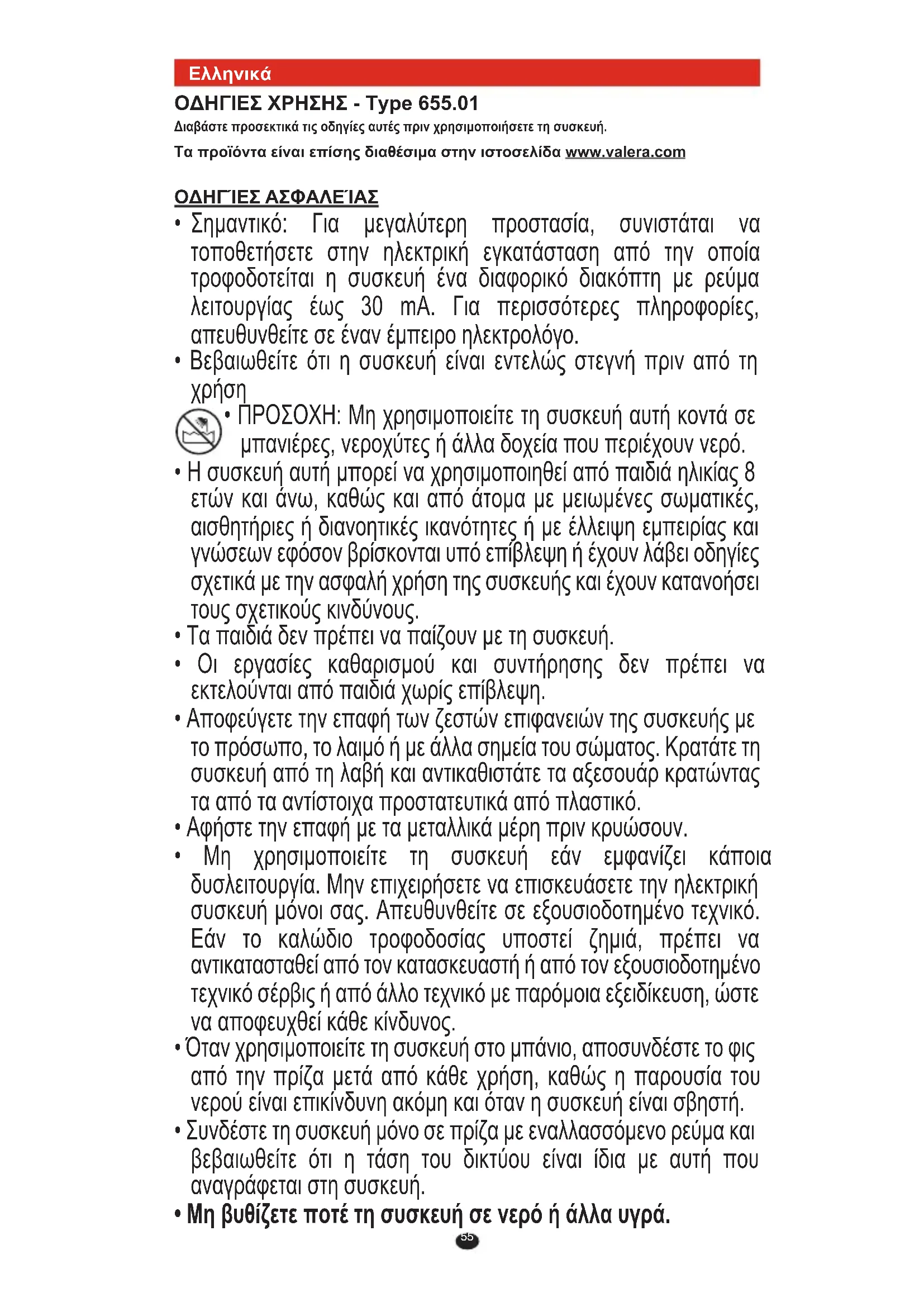 ΟΔΗΓΙΕΣ ΧΡΗΣΗΣ - Type 655.01 Διαβάστε προσεκτικά τις οδηγίες αυτές πριν χρησιμοποιήσετε τη συσκευή. Τα προϊόντα είναι επίσης διαθέσιμα στην ιστοσελίδα www.valera.com ΟΔΗΓΊΕΣ ΑΣΦΑΛΕΊΑΣ