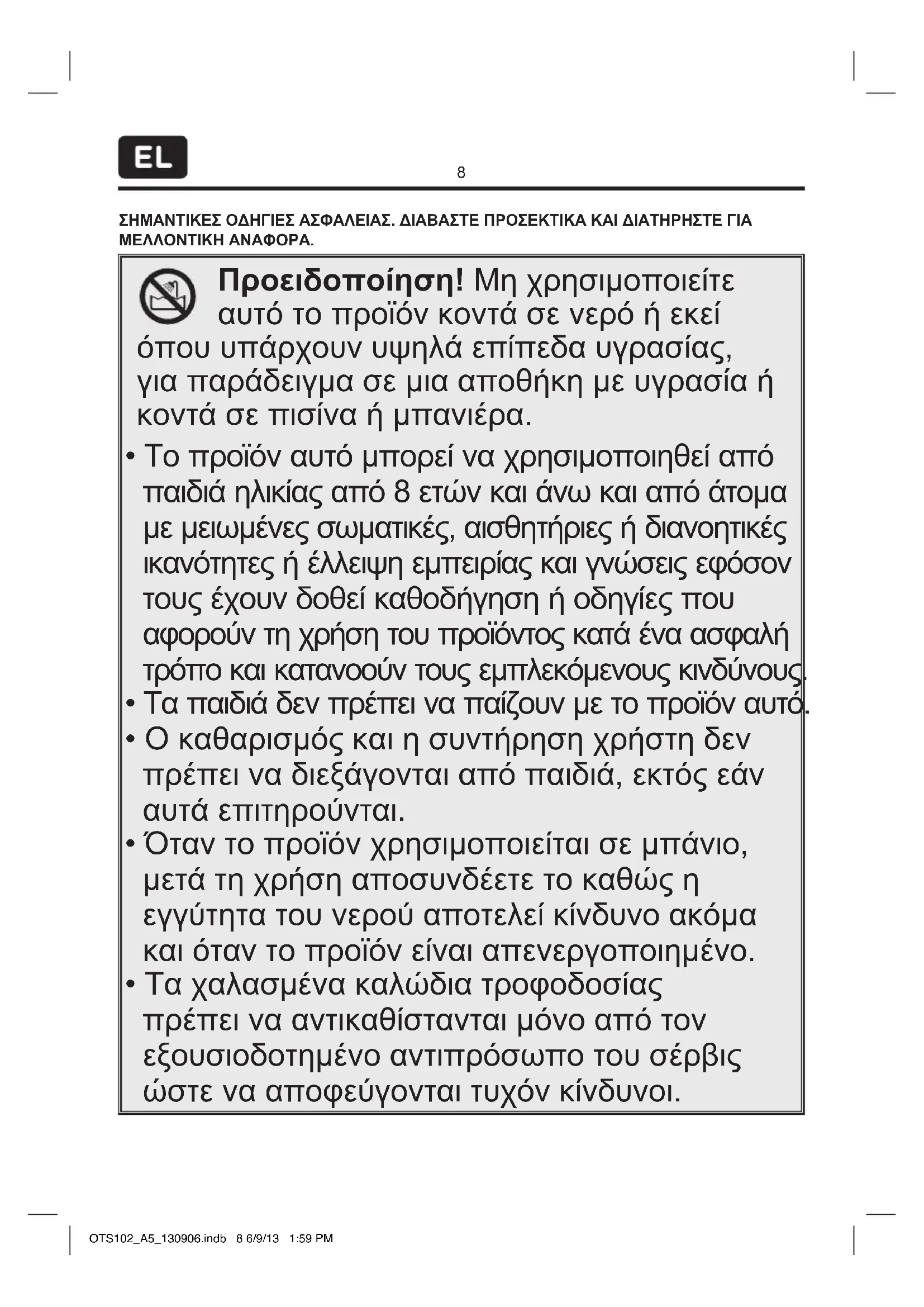 - Das Produkt an einem trockenen, kühlen, vor Feuchtigkeit und direkter Sonneneinstrahlung geschützten Ort aufbewahren. Bewahren Sie das Produkt an einem für Kinder unzugänglichen Ort auf. OTS102_A5_130906.indb 7 6/9/13 1:59 PM8 ΣΗΜΑΝΤΙΚΕΣ ΟΔΗΓΙΕΣ ΑΣΦΑΛΕΙΑΣ. ΔΙΑΒΑΣΤΕ ΠΡΟΣΕΚΤΙΚΑ ΚΑΙ ΔΙΑΤΗΡΗΣΤΕ ΓΙΑ ΜΕΛΛΟΝΤΙΚΗ ΑΝΑΦΟΡΑ. Προειδοποίηση! Μη χρησιμοποιείτε αυτό το προϊόν κοντά σε νερό ή εκεί όπου υπάρχουν υψηλά επίπεδα υγρασίας, για παράδειγμα σε μια αποθήκη με υγρασία ή κοντά σε πισίνα ή μπανιέρα.