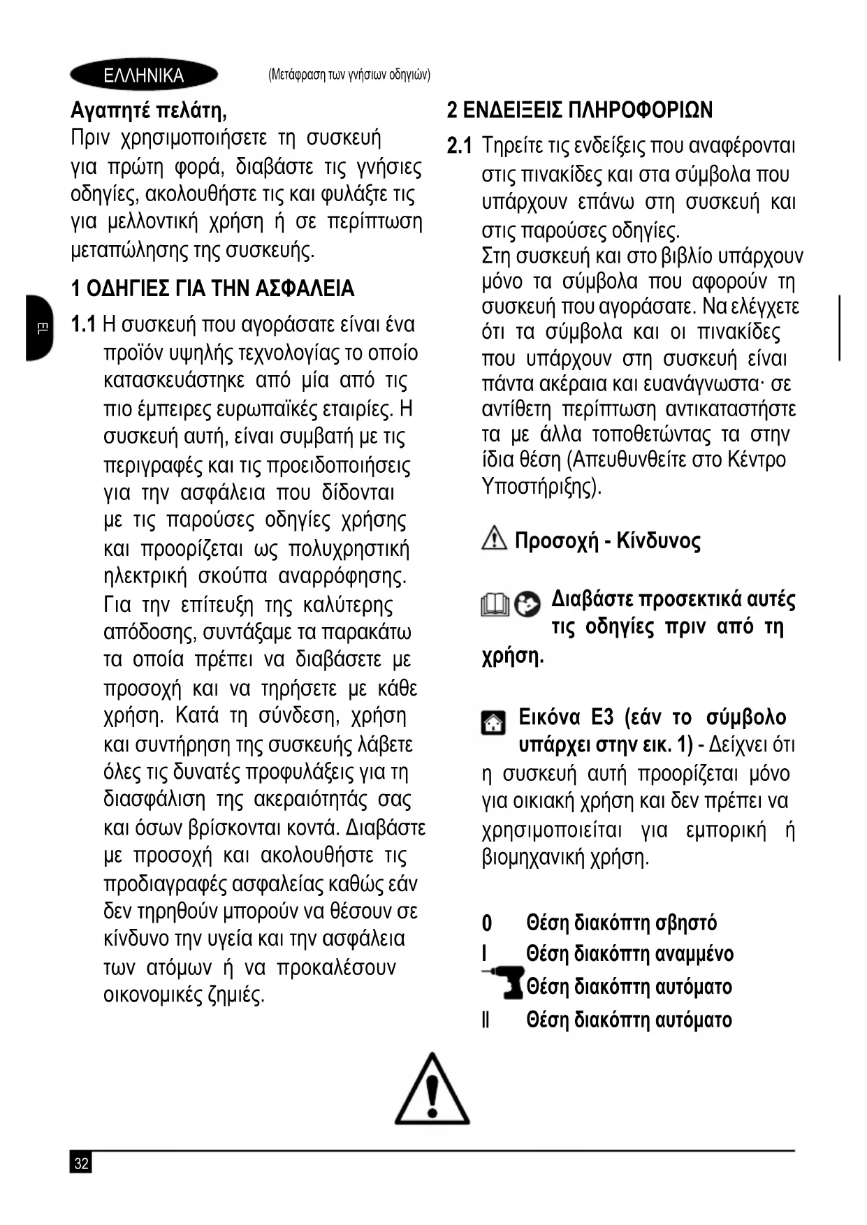 Εικόνα E3 (εάν το σύμβολο υπάρχει στην εικ. 1) - Δείχνει ότι η συσκευή αυτή προορίζεται μόνο για οικιακή χρήση και δεν πρέπει να χρησιμοποιείται για εμπορική ή βιομηχανική χρήση.
