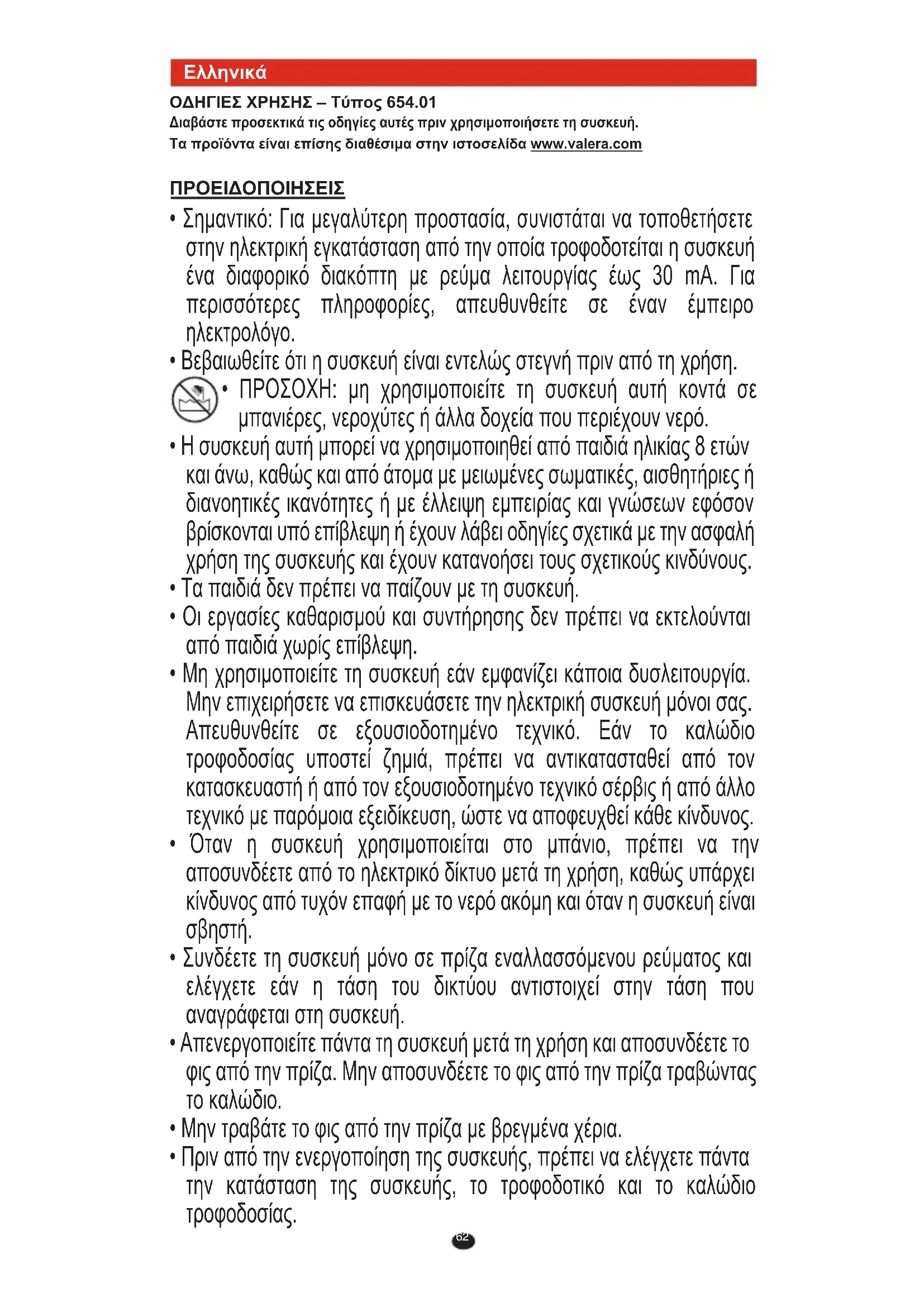 ΟΔΗΓΙΕΣ ΧΡΗΣΗΣ – Τύπος 654.01 Διαβάστε προσεκτικά τις οδηγίες αυτές πριν χρησιμοποιήσετε τη συσκευή. Τα προϊόντα είναι επίσης διαθέσιμα στην ιστοσελίδα www.valera.com ΠΡΟΕΙΔΟΠΟΙΗΣΕΙΣ