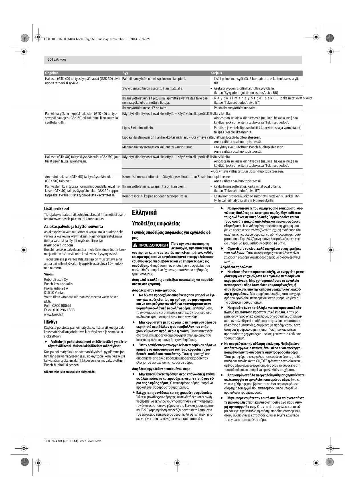 (Βλέπε«Τεχνικά χαρακτηριστικά», σελίδα 62) Ο σωλήνας τροφοδότησης με αέρα 17 έχει τσακίσει. – Αφαιρέστε το τσάκισμα από το σωλήνα τροφοδότησης με αέρα. Τα δίχαλα (GTK 40) ή καρφιά με πεπλατυσμένο κεφάλι (GSK 50) μπήγονται πολύ βαθειά. Η ονομαστική πίεση της τροφοδοσίας πεπιεσμένου αέρα εί- ναι πολύ υψηλή. – Περιορίστε την τροφοδοσία με πεπιεσμένο αέρα, χωρίς, όμως, να κατε- βείτε κάτω από 5 bar. Ο οδηγός βάθους έχει ρυθμιστεί πολύ βαθειά. – Ρυθμίστε τον οδηγό βάθους στο επιθυμητό βάθος. (Βλέπε «Ρύθμιση οδηγού βάθους», σελίδα 63) Έχει φθαρεί ο τάκος απόσβεσης. – Απευθυνθείτε σε ένα εξουσιοδοτημένο κατάστημα Service της Bosch. Δώστε εκεί το εξάρτημα για επισκευή. OBJ_BUCH-1038-004.book Page 64 Tuesday, November 11, 2014 2:36 PMBosch Power Tools 1 609 92A 10X | (11.11.14) Türkçe | 65